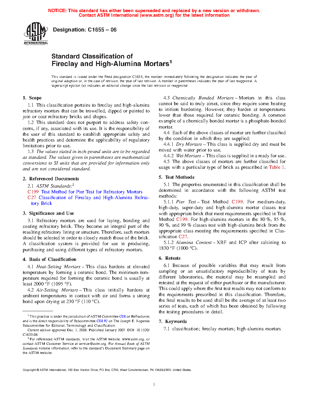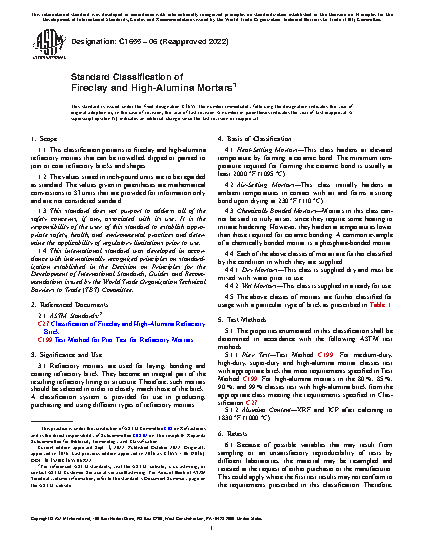 1.1 This classification pertains to fireclay and high-alumina refractory mortars that can be trowelled, dipped or painted to join or coat refractory bricks and shapes.