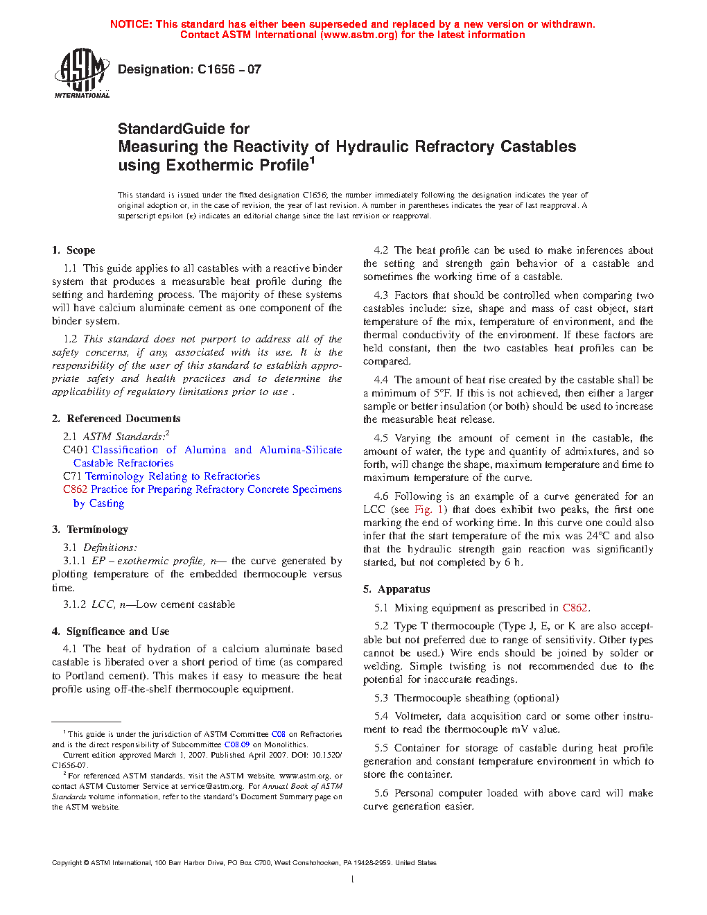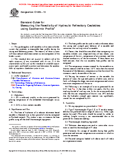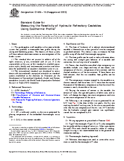 1.1 This guide applies to all castables with a reactive binder system that produces a measurable heat profile during the setting and hardening process. The majority of these systems will have calcium aluminate cement as one component of the binder system.