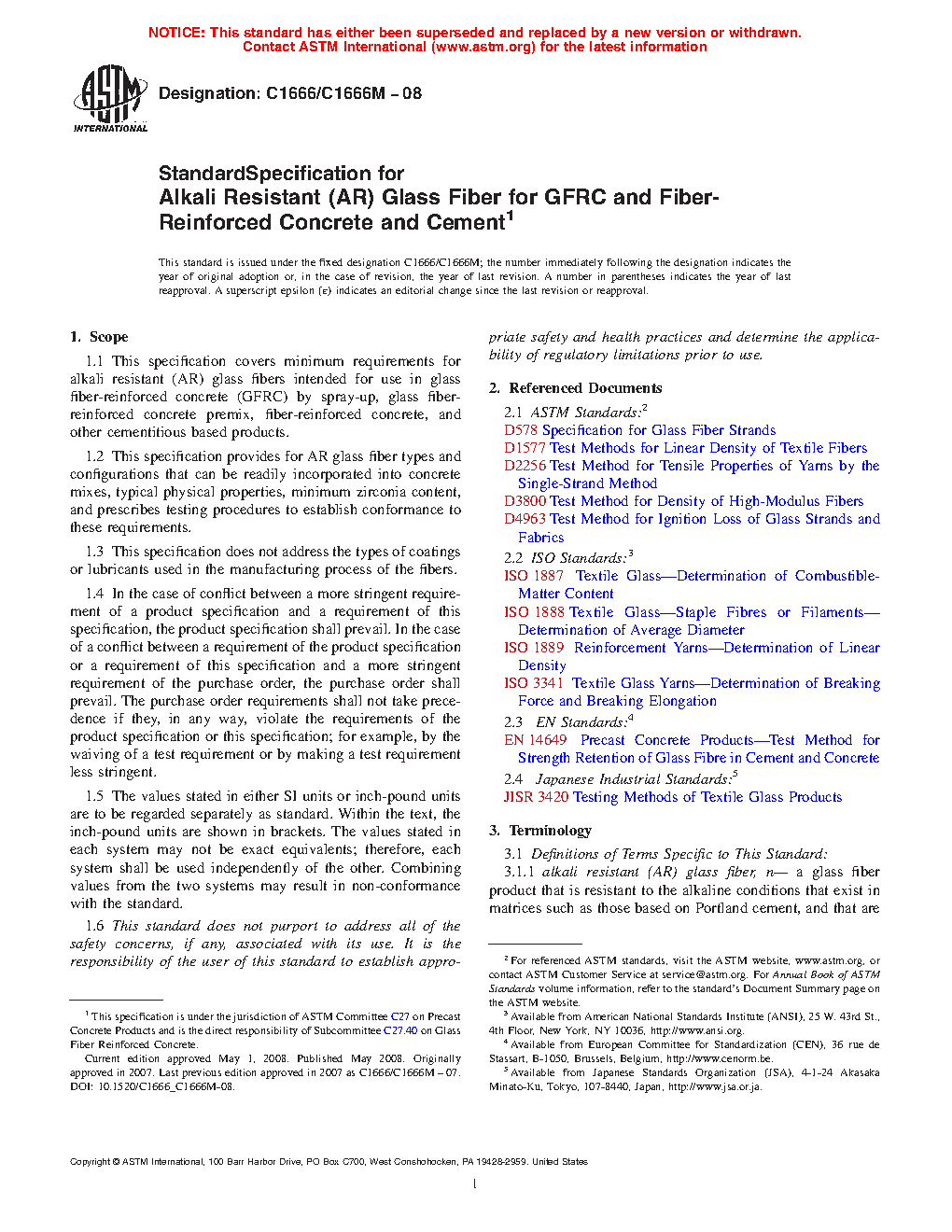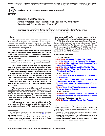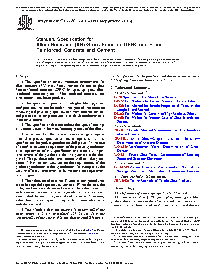 1.2 This specification provides for AR glass fiber types and configurations that can be readily incorporated into concrete mixes, typical physical properties, minimum zirconia content, and prescribes testing procedures to establish conformance to these requirements.