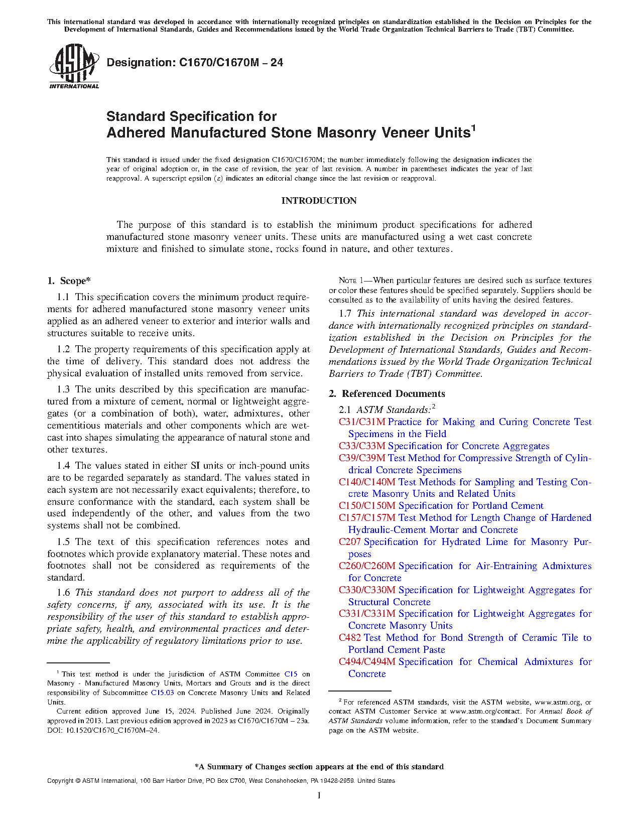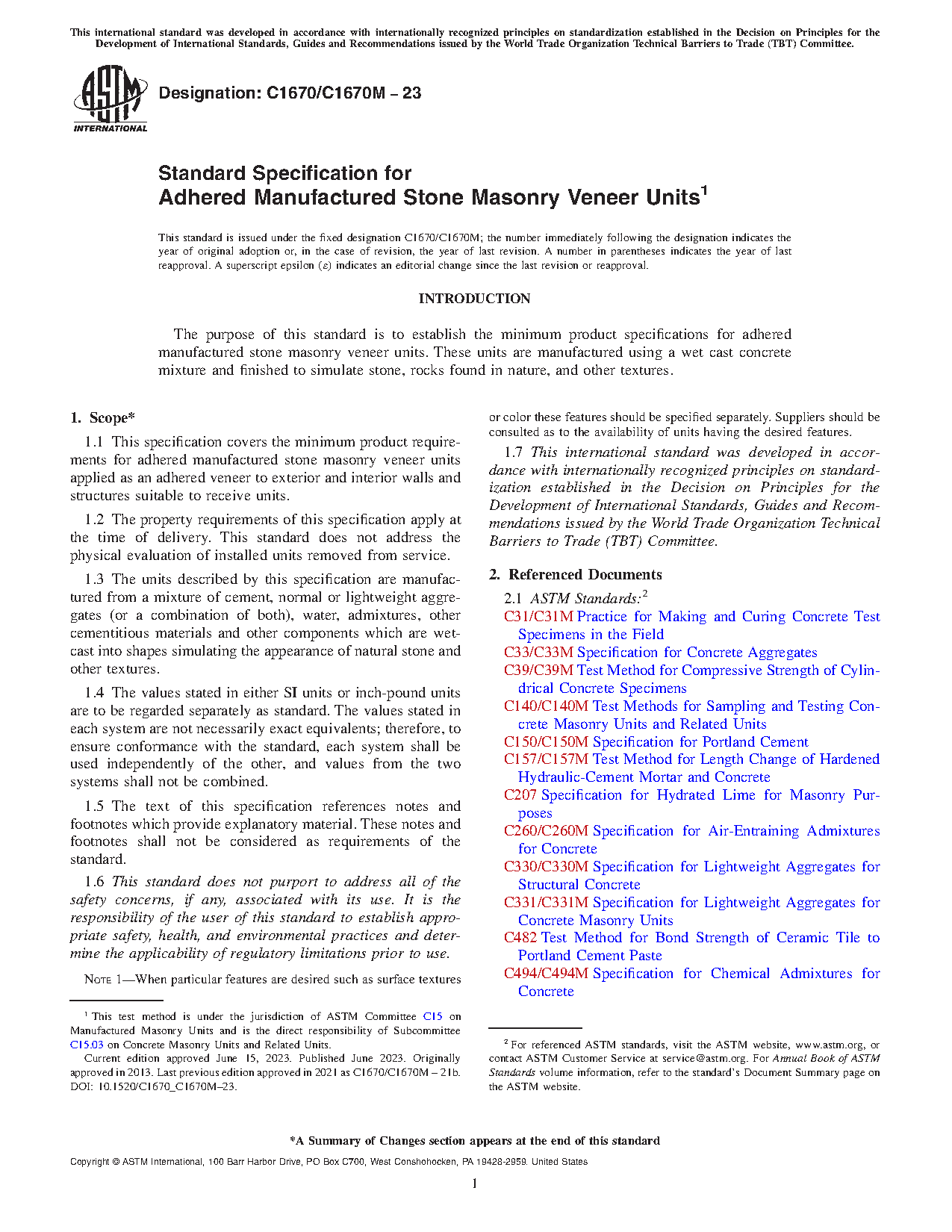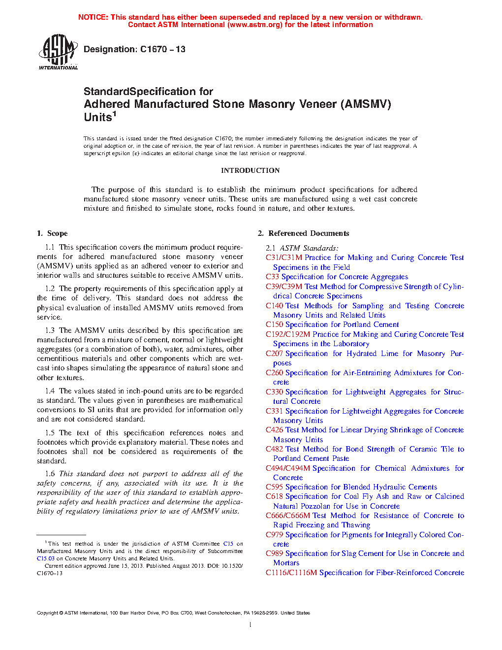 1.1 This specification covers the minimum product requirements for adhered manufactured stone masonry veneer units applied as an adhered veneer to exterior and interior walls and structures suitable to receive units.