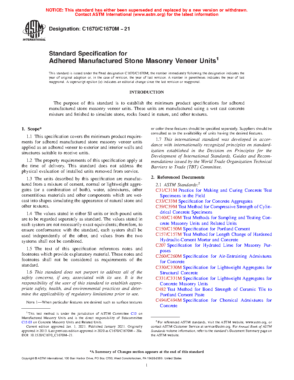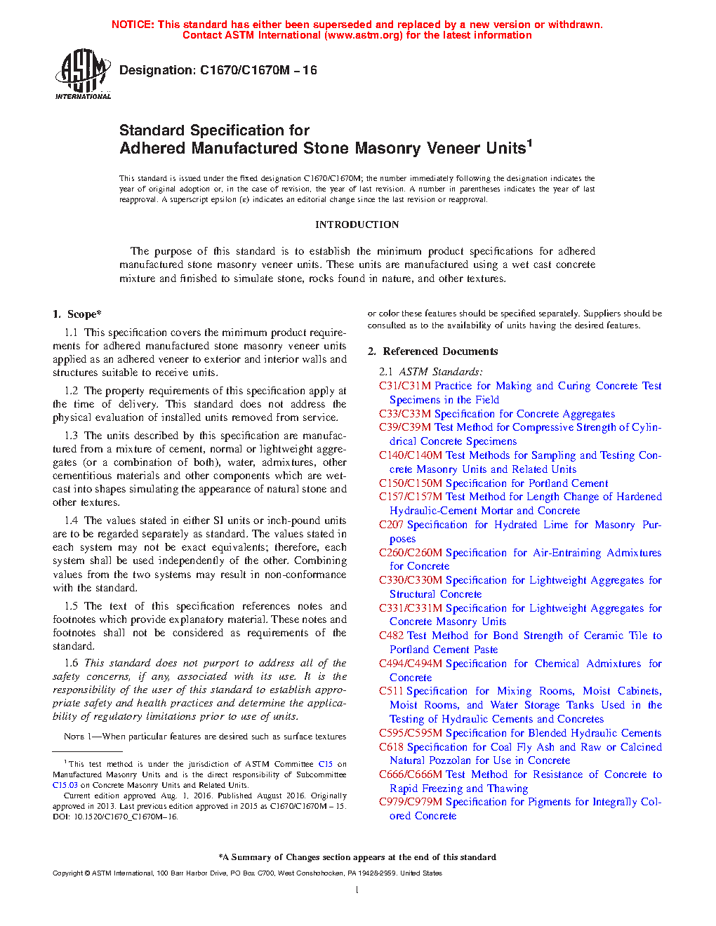 This specification establishes the minimum product requirements for adhered manufactured stone masonry veneer (AMSMV) units which are manufactured from cementitious materials, aggregates, air-entraining admixtures, concrete admixtures, coloring pigments, reinforcement fibers, and other components which are wet-cast into shapes simulating the appearance of stone, rocks found in nature, and other textures. It also addresses sampling, physical properties and testing, finish and appearance, product identification and packaging, and reporting.