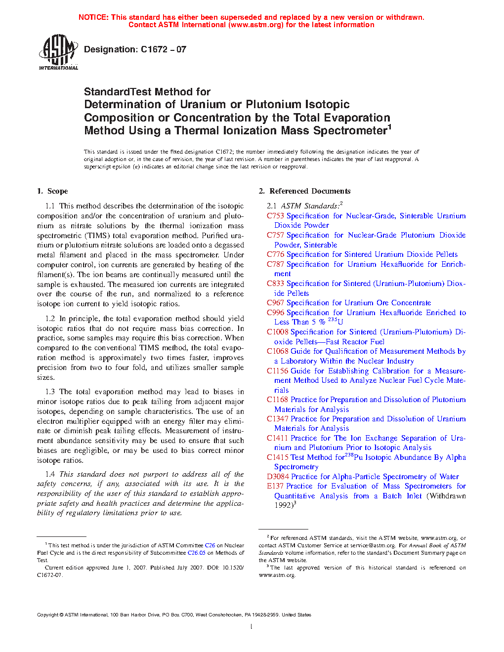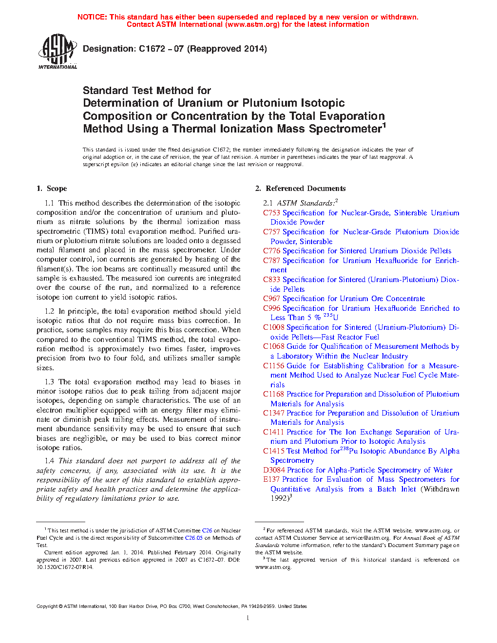 1.2 In principle, the total evaporation method should yield isotope ratios that do not require mass bias correction. In practice, samples may require this bias correction. Compared to the conventional TIMS method described in Test Method C1625, the total evaporation method is approximately two times faster, improves precision of the isotope ratio measurements by a factor of two to four, and utilizes smaller sample sizes. Compared to the C1625 method, the total evaporation method provides “major” isotope ratios 235U/238U, 240Pu/239Pu, and 241Am/243Am with improved accuracy.