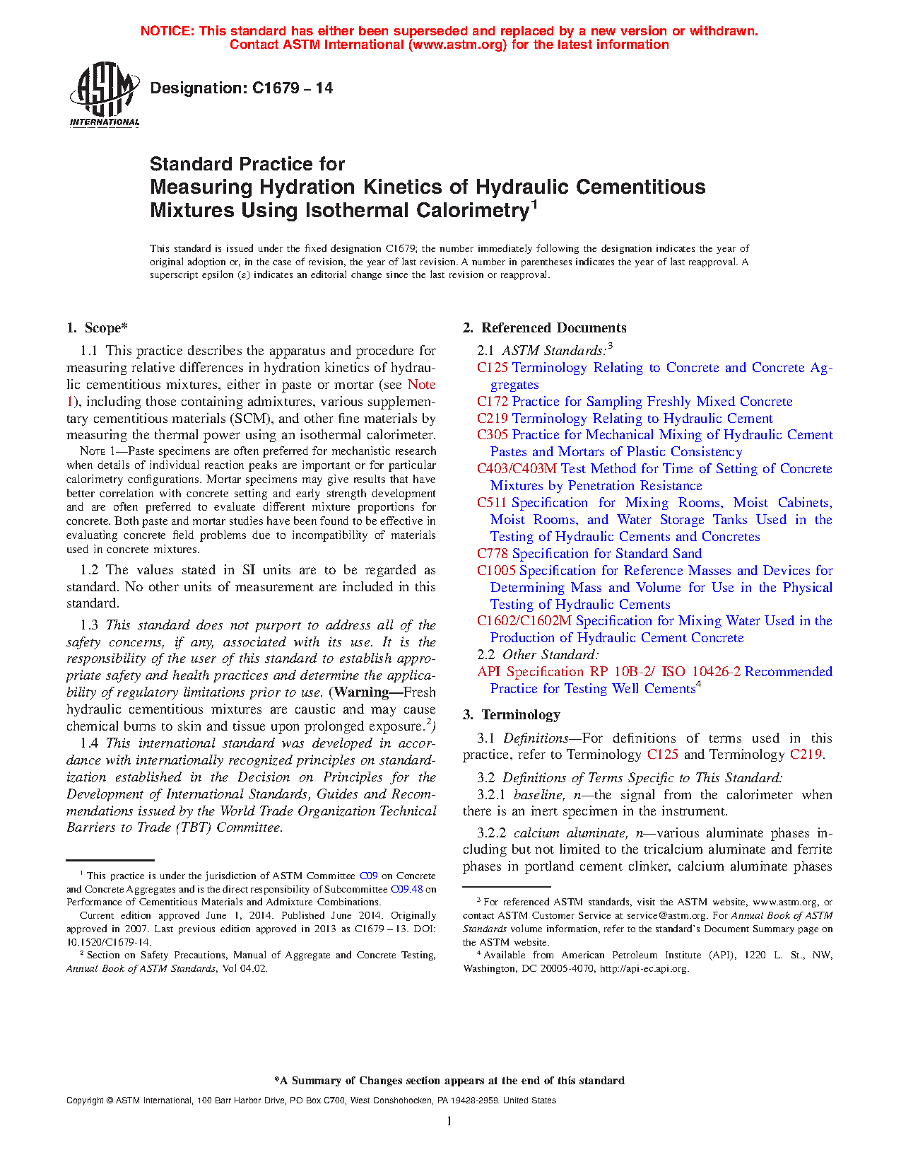 1.1 This practice describes the apparatus and procedure for measuring relative differences in hydration kinetics of hydraulic cementitious mixtures, either in paste or mortar (see Note 1), including those containing admixtures, various supplementary cementitious materials (SCM), and other fine materials by measuring the thermal power using an isothermal calorimeter.