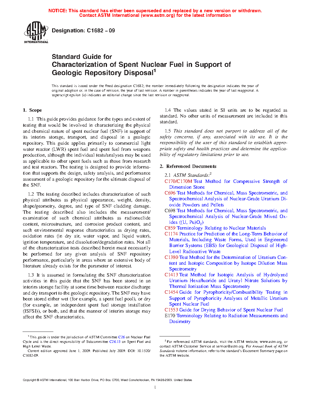 1.2 The testing described includes characterization of such physical attributes as physical appearance, weight, density, shape/geometry, degree, and type of SNF cladding damage. The testing described also includes the measurement/examination of such chemical attributes as radionuclide content, microstructure, and corrosion product content, and such environmental response characteristics as drying rates, oxidation rates (in dry air, water vapor, and liquid water), ignition temperature, and dissolution/degradation rates. Not all of the characterization tests described herein must necessarily be performed for any given analysis of SNF performance for interim storage, transportation, or geological repository disposal, particularly in areas where an extensive body of literature already exists for the parameter of interest in the specific service condition.
