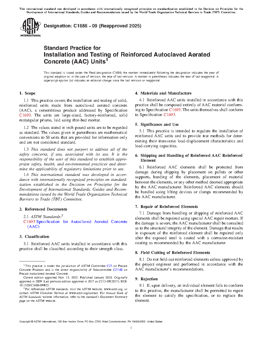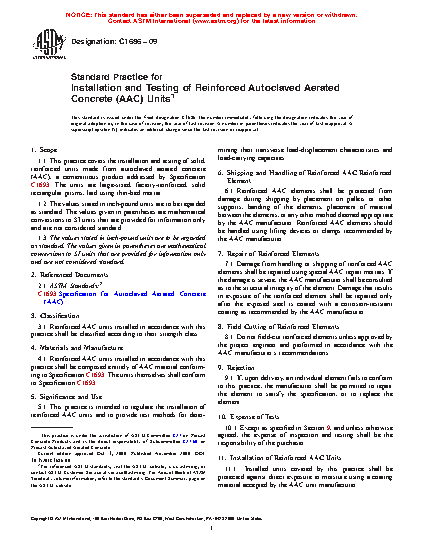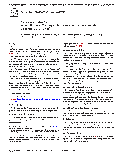 1.1 This practice covers the installation and testing of solid, reinforced units made from autoclaved aerated concrete (AAC), a cementitious product addressed by Specification C1693. The units are large-sized, factory-reinforced, solid rectangular prisms, laid using thin-bed mortar.