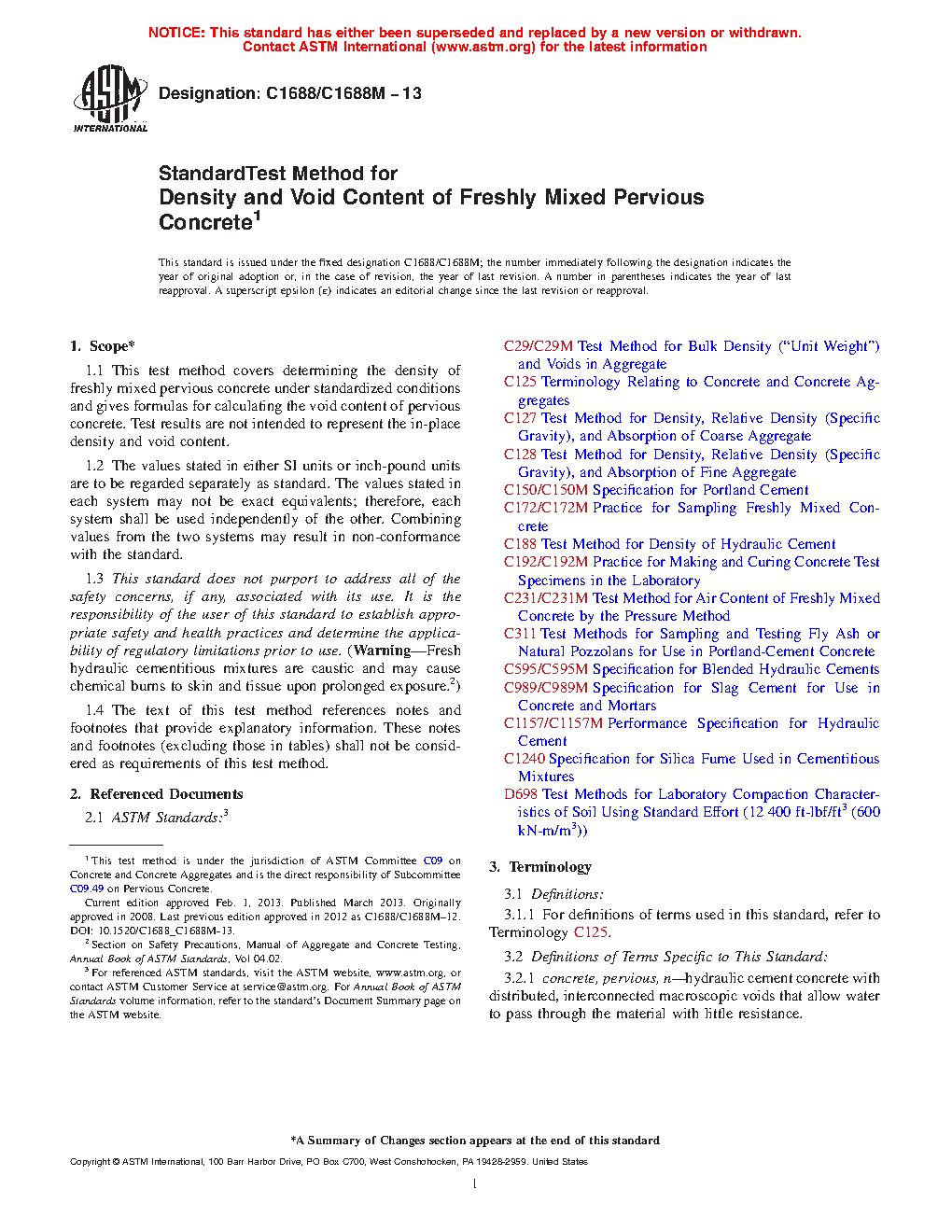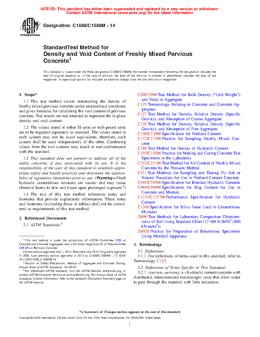 5.4 This method uses a standard consolidation procedure to measure fresh density and void content of a pervious concrete mixture as delivered. Test results are not intended to represent the density and void content of the in-place pervious concrete. This method shall not be used to determine the in-place void content or yield of the pervious concrete.
