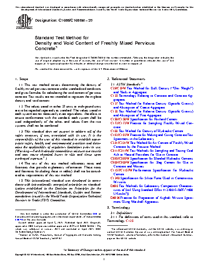 1.1 This test method covers determining the density of freshly mixed pervious concrete under standardized conditions and gives formulas for calculating the void content of pervious concrete. Test results are not intended to represent the in-place density and void content.
