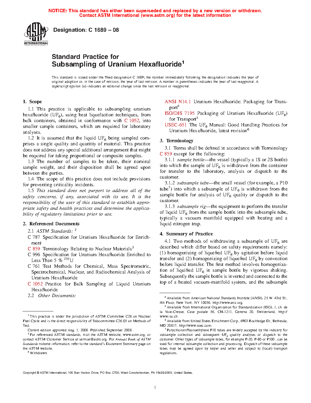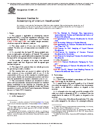 1.3 It is assumed that the liquid UF6 being sampled comprises a single quality and quantity of material. This practice does not address any special additional arrangement that might be required for taking proportional or composite samples.