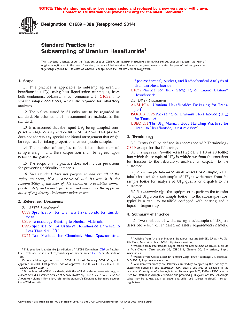 5.1 Uranium hexafluoride is normally produced and handled in large (typically 1- to 14-ton) quantities and must, therefore be characterized by reference to representative samples. The samples are used to determine compliance with the applicable commercial Specifications C996 and C787 by means of the appropriate test method (for example, Test Method C761 and references therein). The quantities involved, physical properties, chemical reactivity, and hazardous nature of UF6 are such that for representative sampling, specially designated equipment must be used and operated in accordance with the most carefully controlled and stringent procedures. This practice indicates appropriate principles, equipment and procedures currently in use for subsampling of liquid UF6. It is used by UF6 converters, enrichers and fuel fabricators to review the effectiveness of existing procedures or to design equipment and procedures for future use. Other subsampling procedures such as UF6 vapor sampling are not directly representative of the chemical quality of liquid UF6.