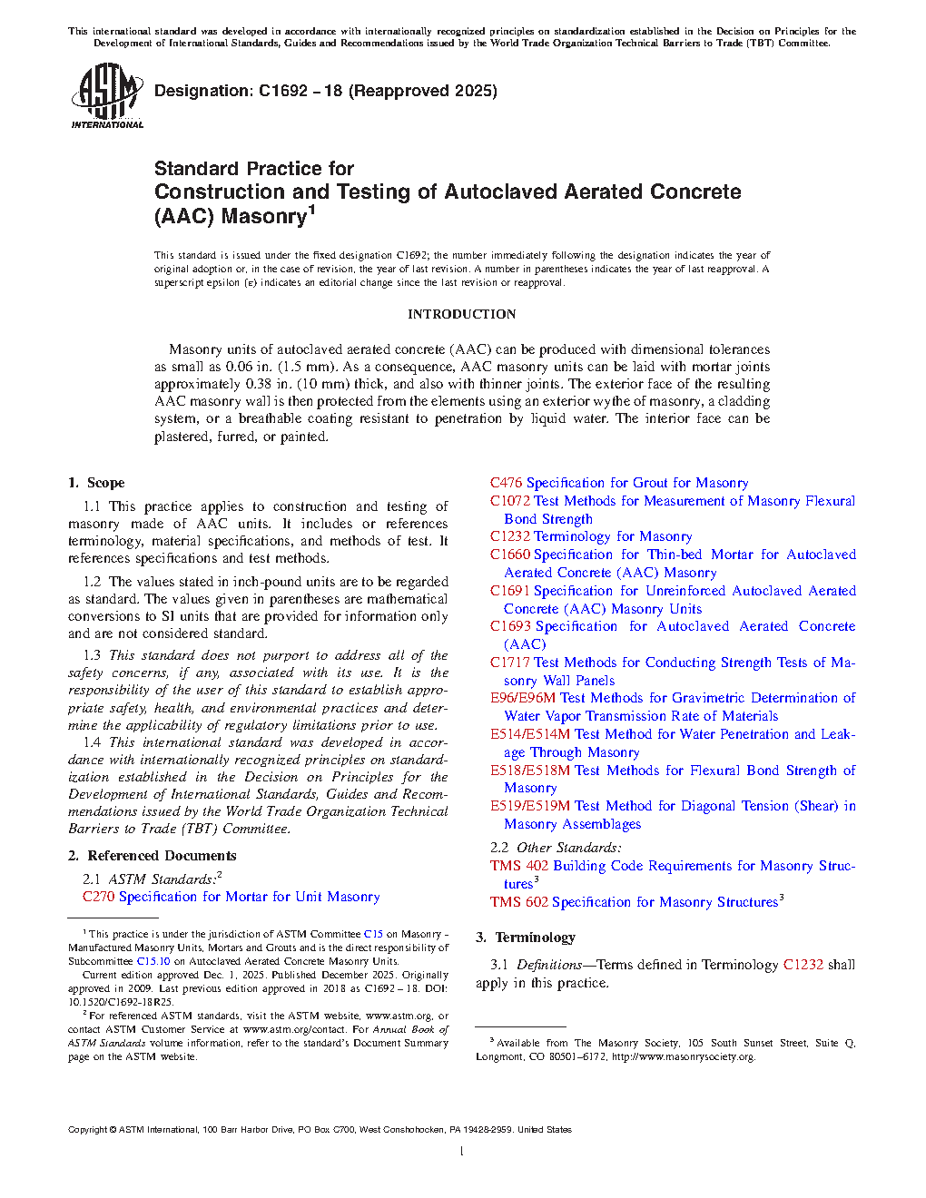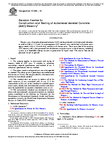 1.1 This practice applies to construction and testing of masonry made of AAC units. It includes or references terminology, material specifications, and methods of test. It references specifications and test methods.