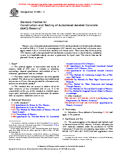 This practice applies to the materials and methods used in the construction of AAC masonry. It directly references the AAC materials standards under the jurisdiction of ASTM Committee C27 and the workmanship requirements of TMS 602-08 / ACI 530.1-08 / ASCE 6-08 and supplements those workmanship requirements with additional requirements particular to AAC masonry.