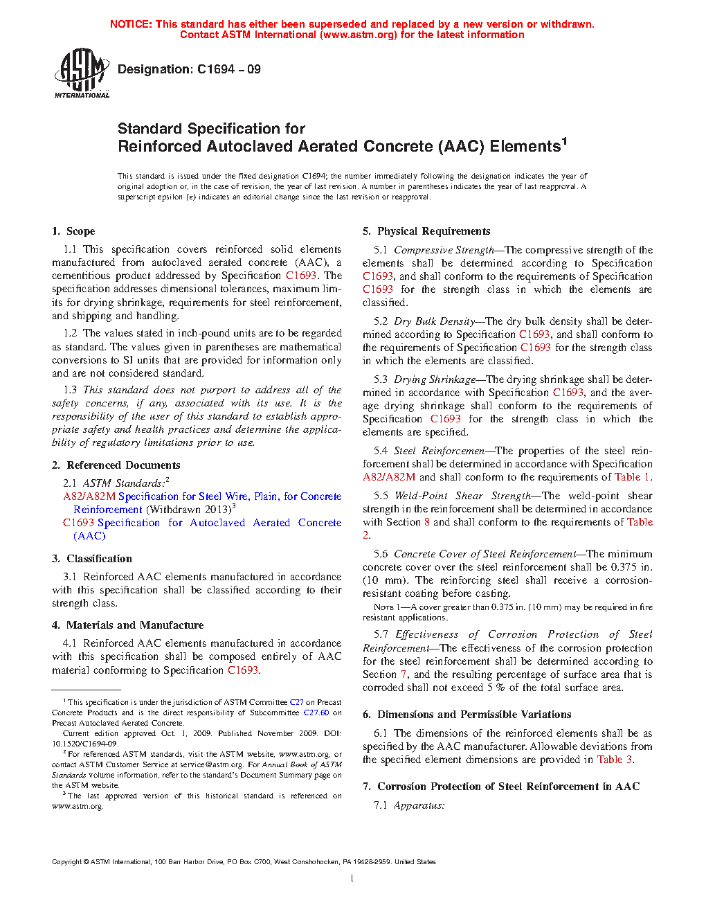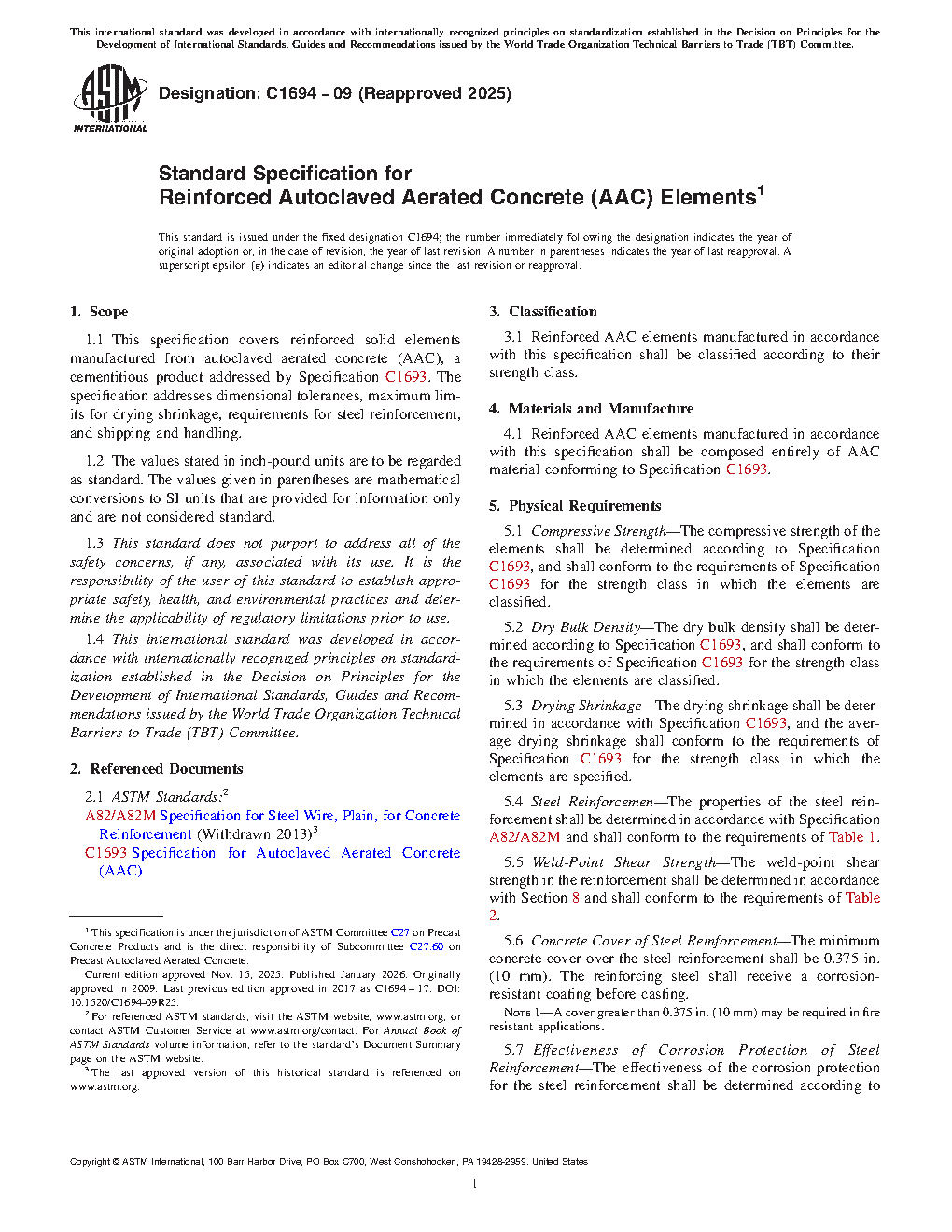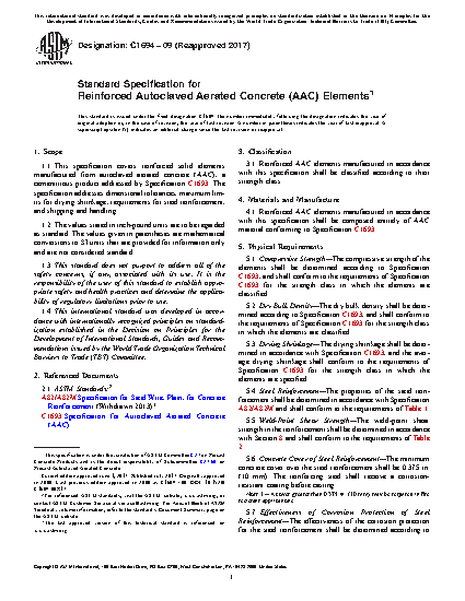 1.1 This specification covers reinforced solid elements manufactured from autoclaved aerated concrete (AAC), a cementitious product addressed by Specification C1693. The specification addresses dimensional tolerances, maximum limits for drying shrinkage, requirements for steel reinforcement, and shipping and handling.