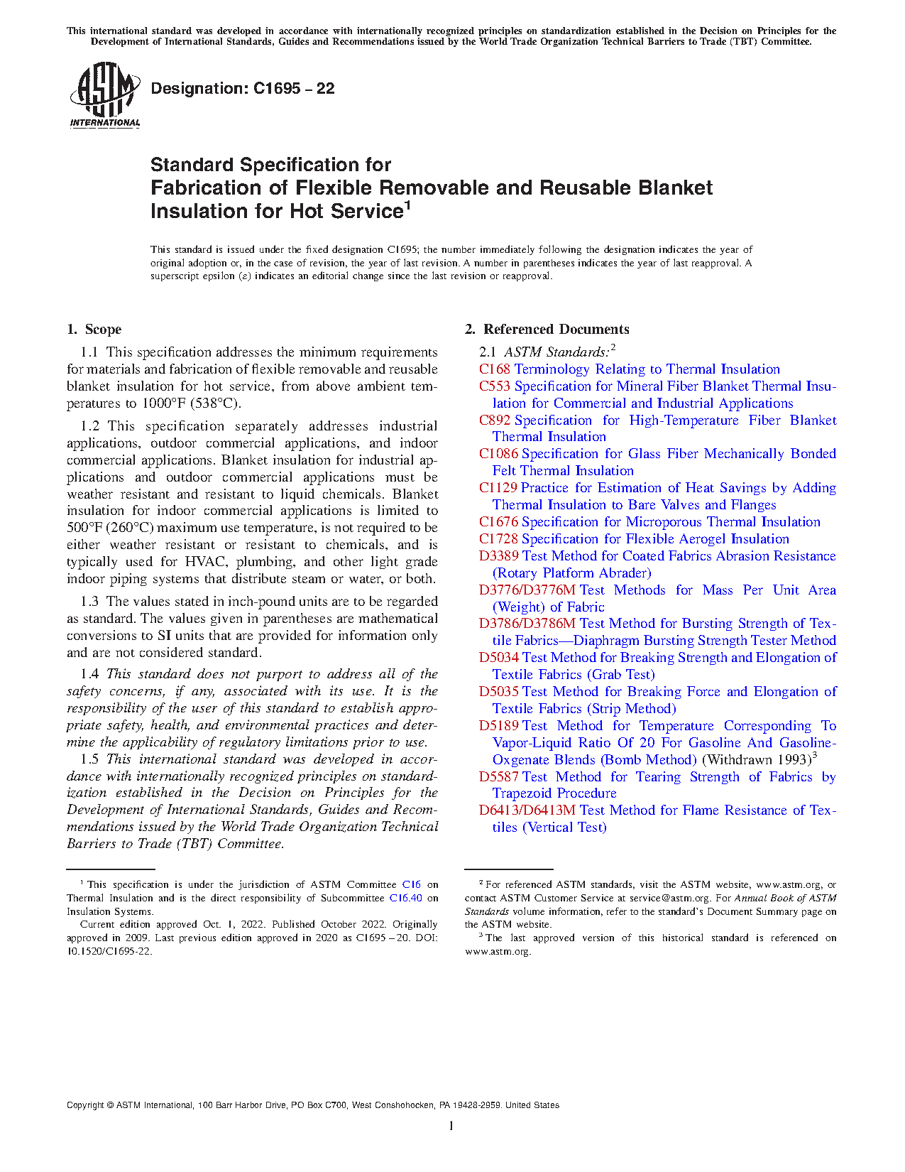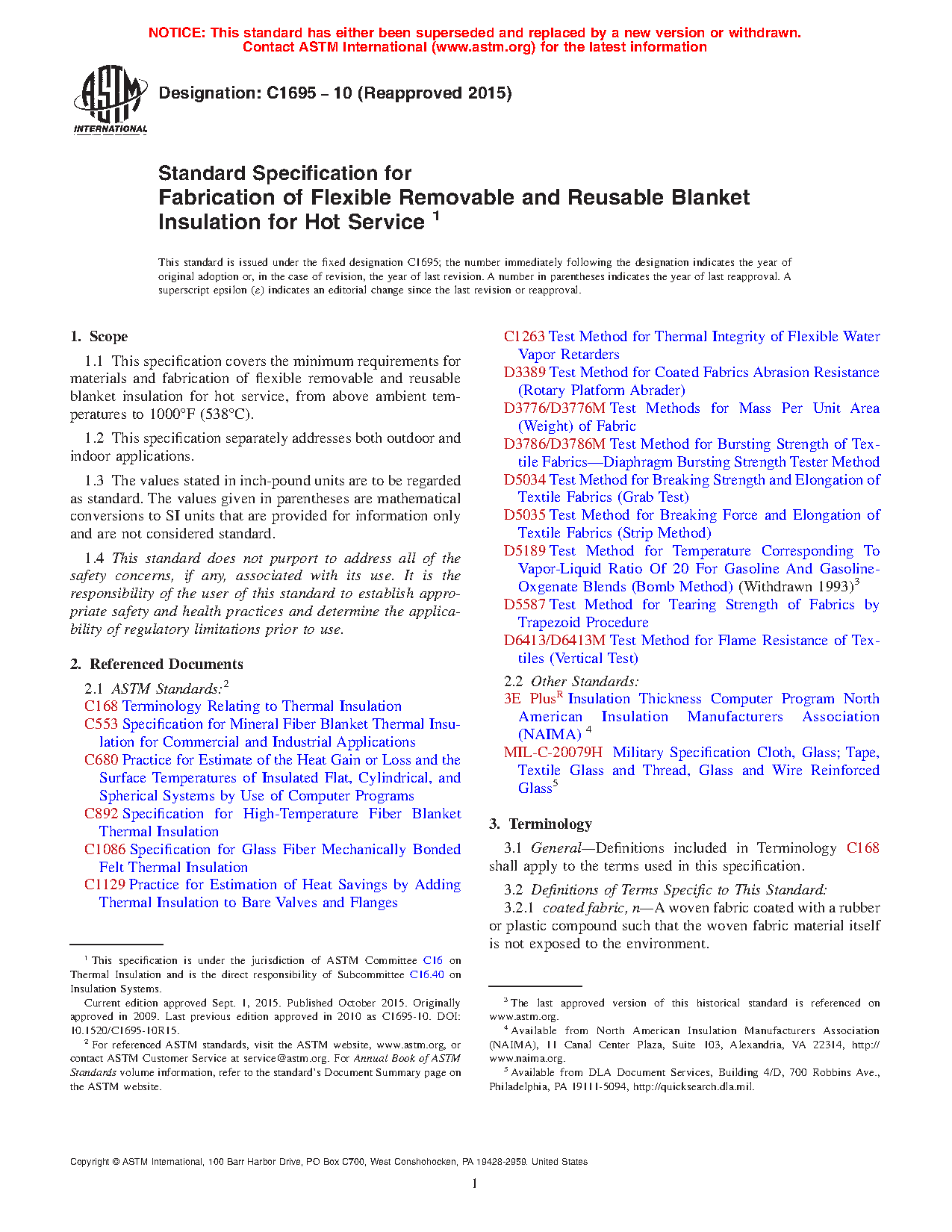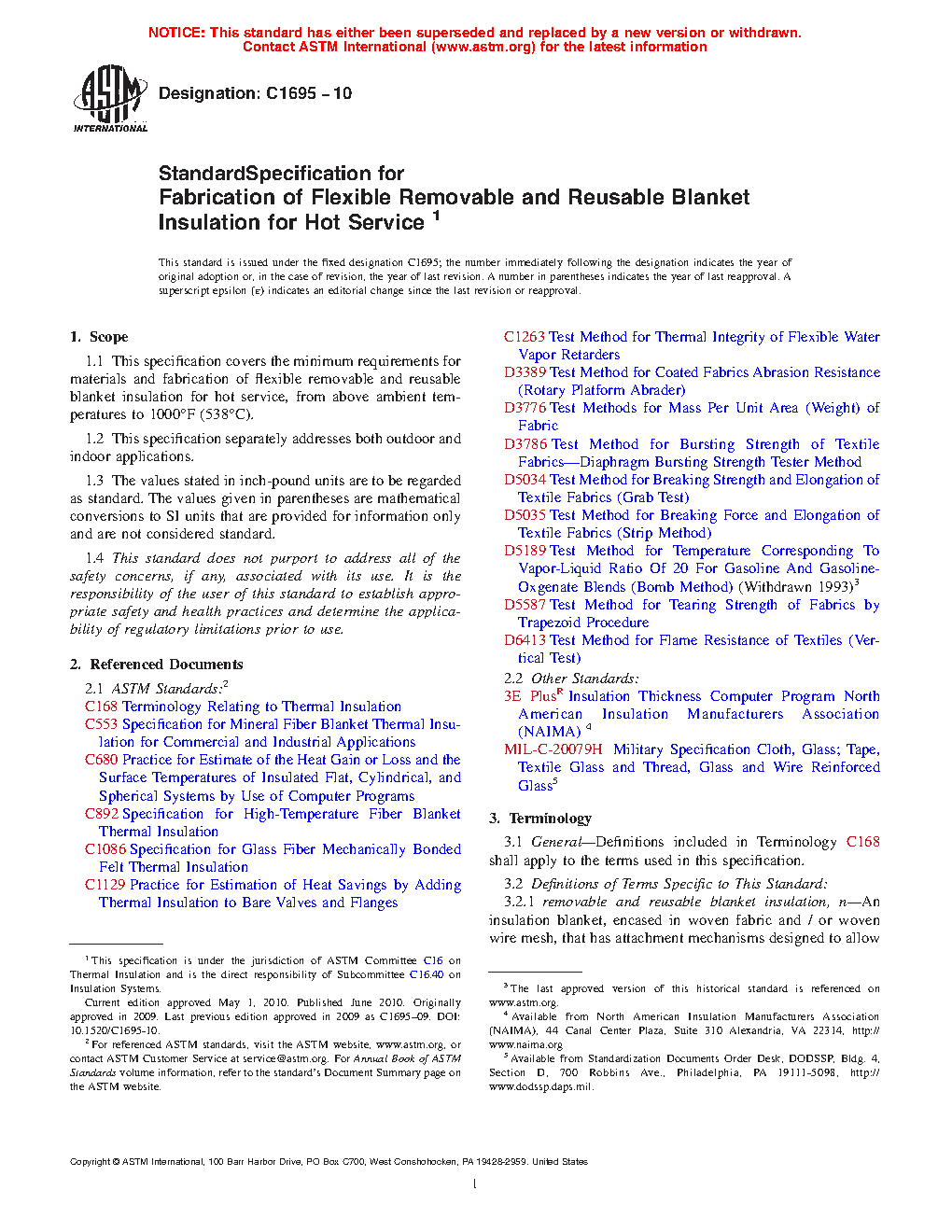 1.1 This specification covers the minimum requirements for materials and fabrication of flexible removable and reusable blanket insulation for hot service, from above ambient temperatures to 1000°F (538°C).