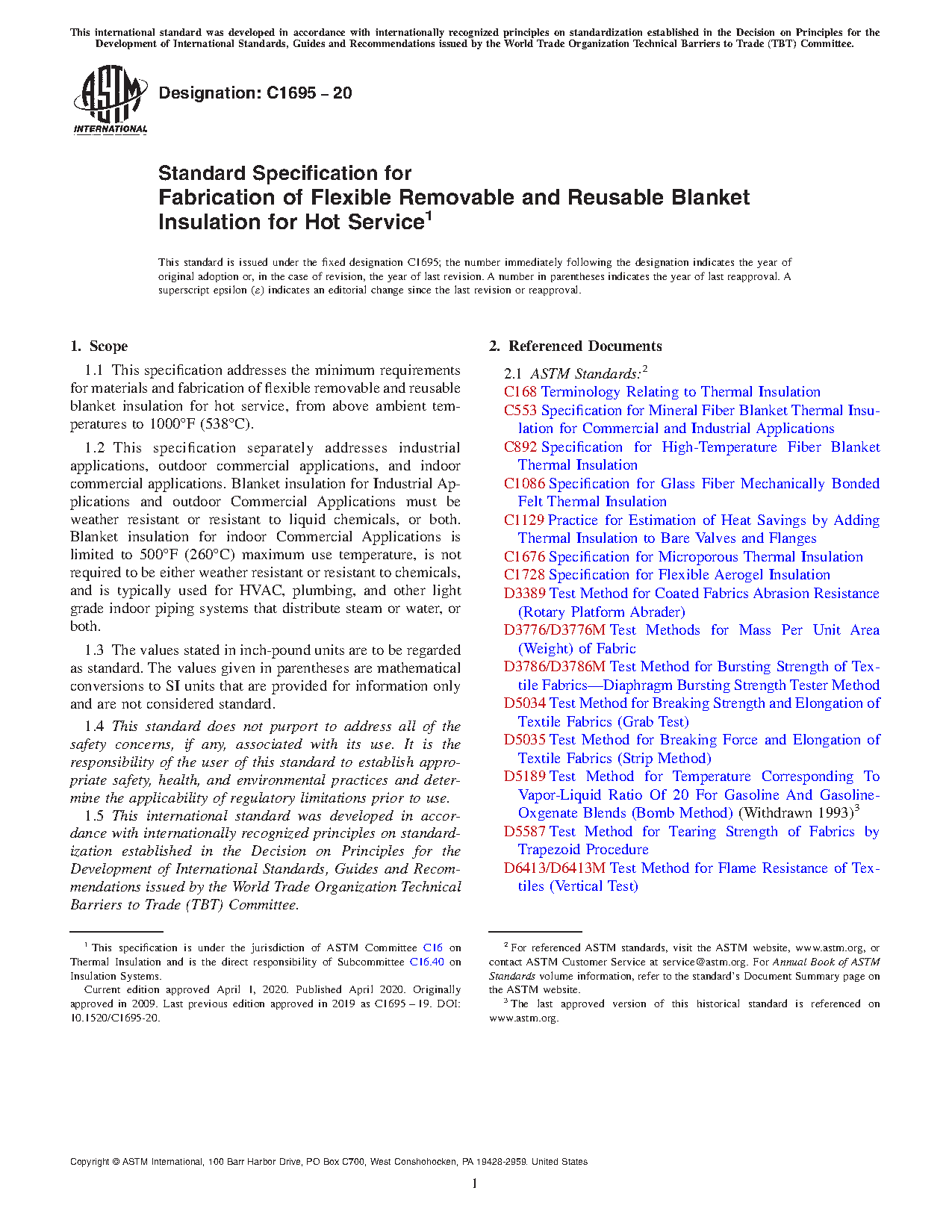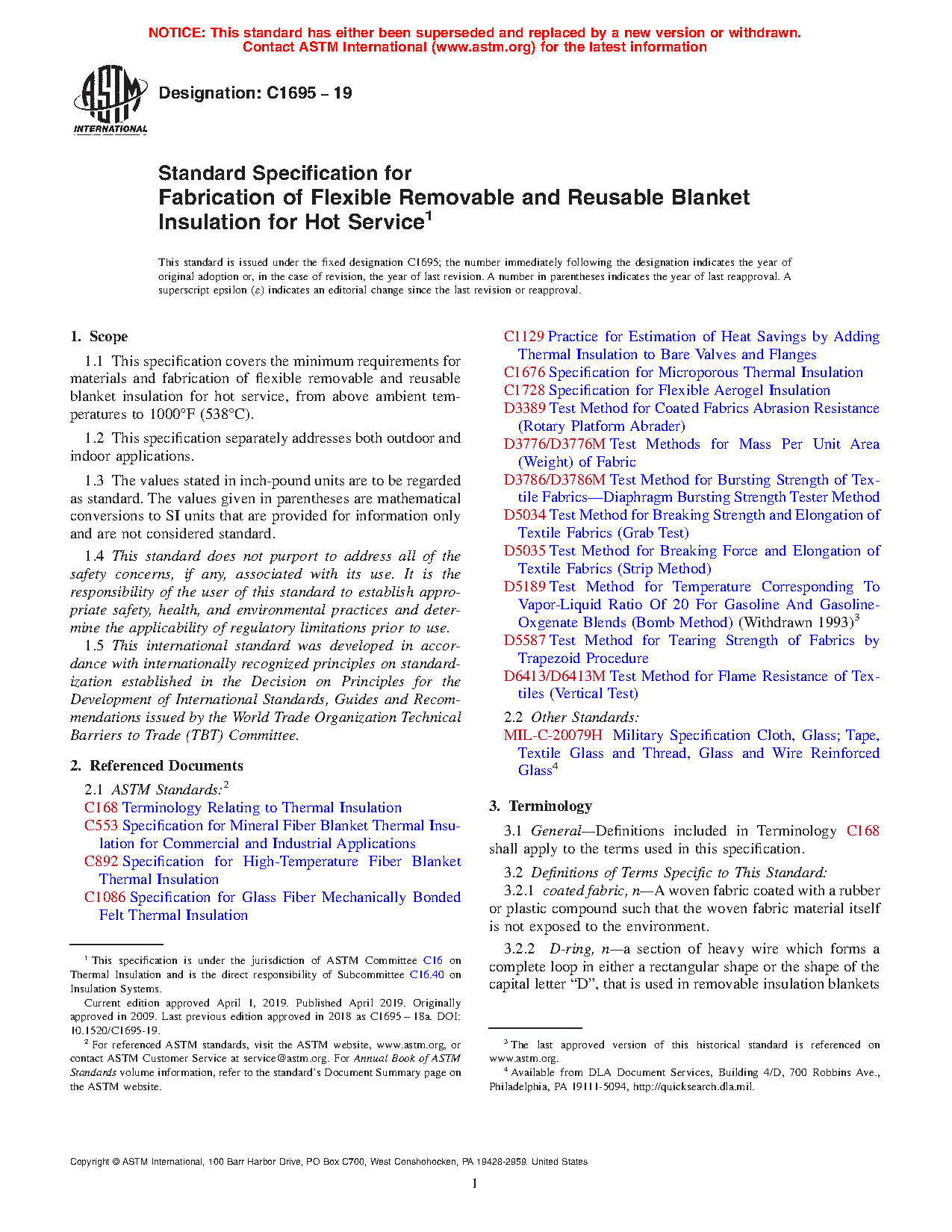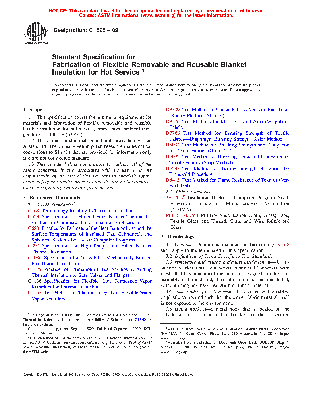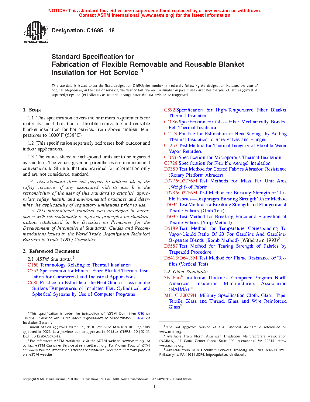 1.1 This specification covers the minimum requirements for materials and fabrication of flexible removable and reusable blanket insulation for hot service, from above ambient temperatures to 1000°F (538°C).