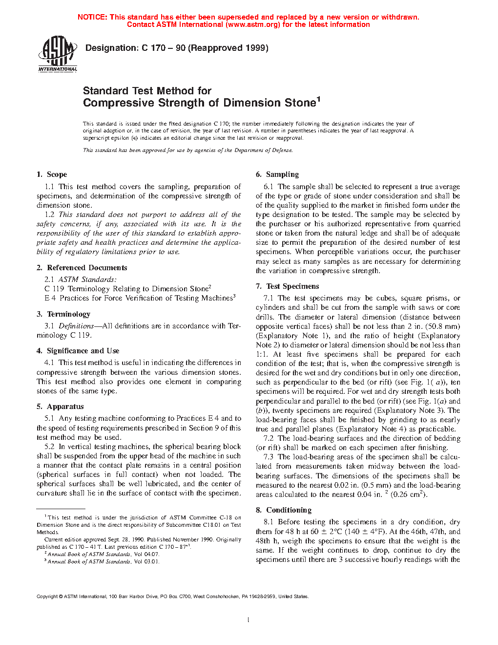 1.1 This test method covers the sampling, preparation of specimens, and determination of the compressive strength of dimension stone.