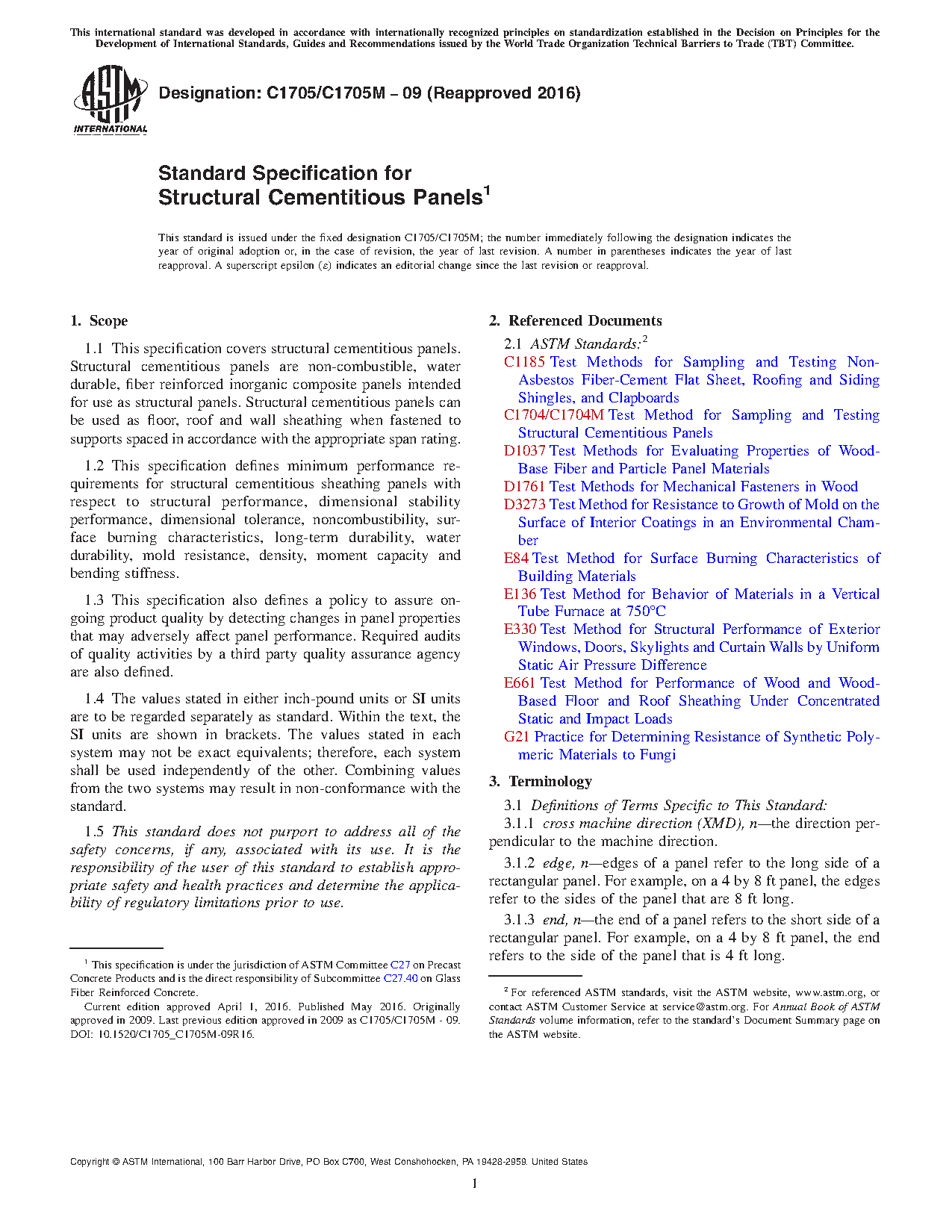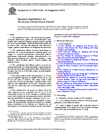 This specification covers structural cementitious panels and defines minimum performance requirements for structural cementitious sheathing panels with respect to structural performance, dimensional stability performance, dimensional tolerance, noncombustibility, surface burning characteristics, long-term durability, water durability, mold resistance, density, moment capacity, and bending stiffness. Structural cementitious panels are non-combustible, water durable, fiber reinforced inorganic composite panels that can be used as floor, roof, and wall sheathing when fastened to supports spaced in accordance with the appropriate span rating. Qualification procedures and initial testing methods shall be conducted to demonstrate the performance characteristics of the panels. Statistical analysis shall also be performed for sampling and inspection of the panel samples.