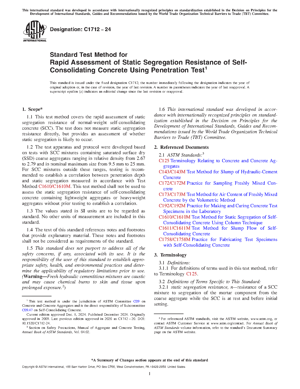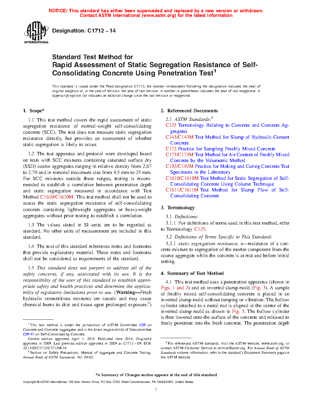 1.2 The test apparatus and protocol were developed based on tests with SCC mixtures containing saturated surface dry (SSD) coarse aggregates ranging in relative density from 2.67 to 2.79 and in nominal maximum size from 9.5 mm to 25 mm. For SCC mixtures outside these ranges, testing is recommended to establish a correlation between penetration depth and static segregation measured in accordance with Test Method C1610/C1610M. This test method shall not be used to assess the static segregation resistance of self-consolidating concrete containing lightweight aggregates or heavyweight aggregates without prior testing to establish a correlation.
