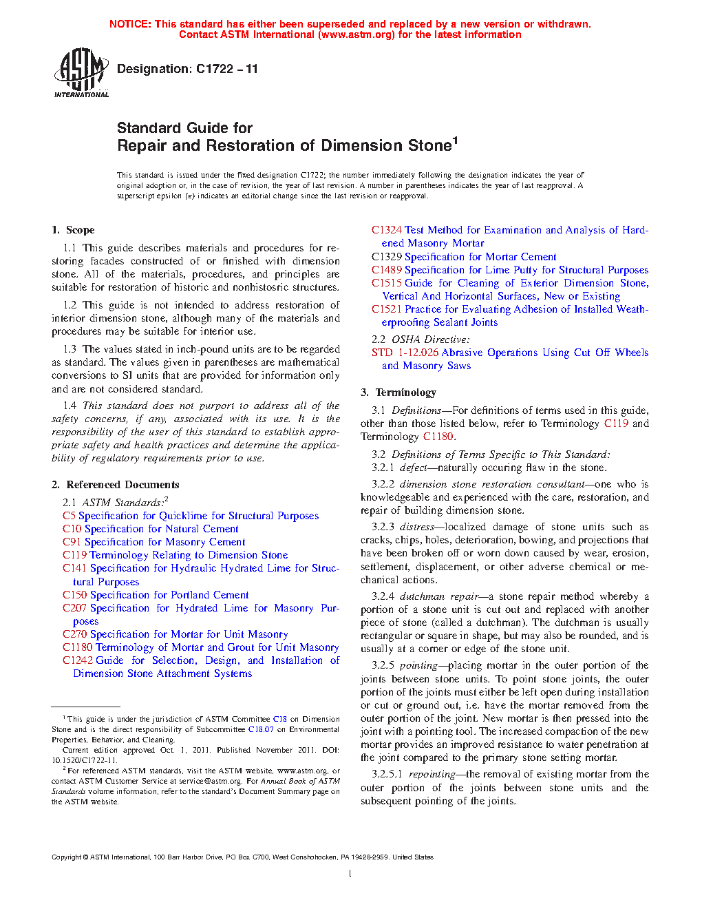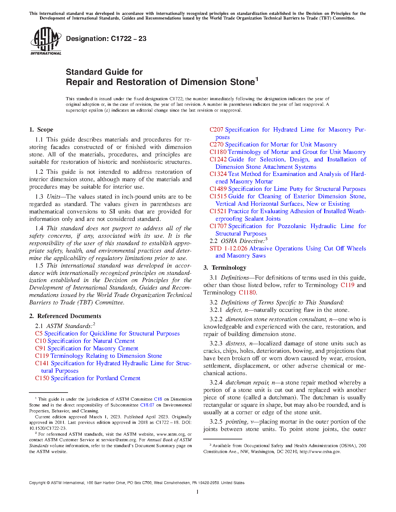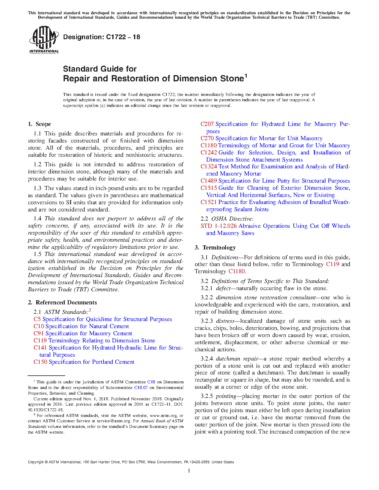 1.1 This guide describes materials and procedures for restoring facades constructed of or finished with dimension stone. All of the materials, procedures, and principles are suitable for restoration of historic and nonhistosric structures.