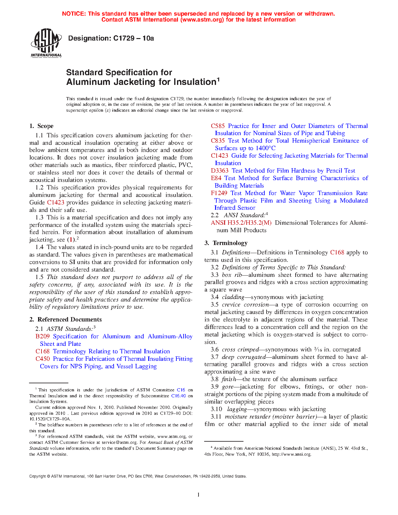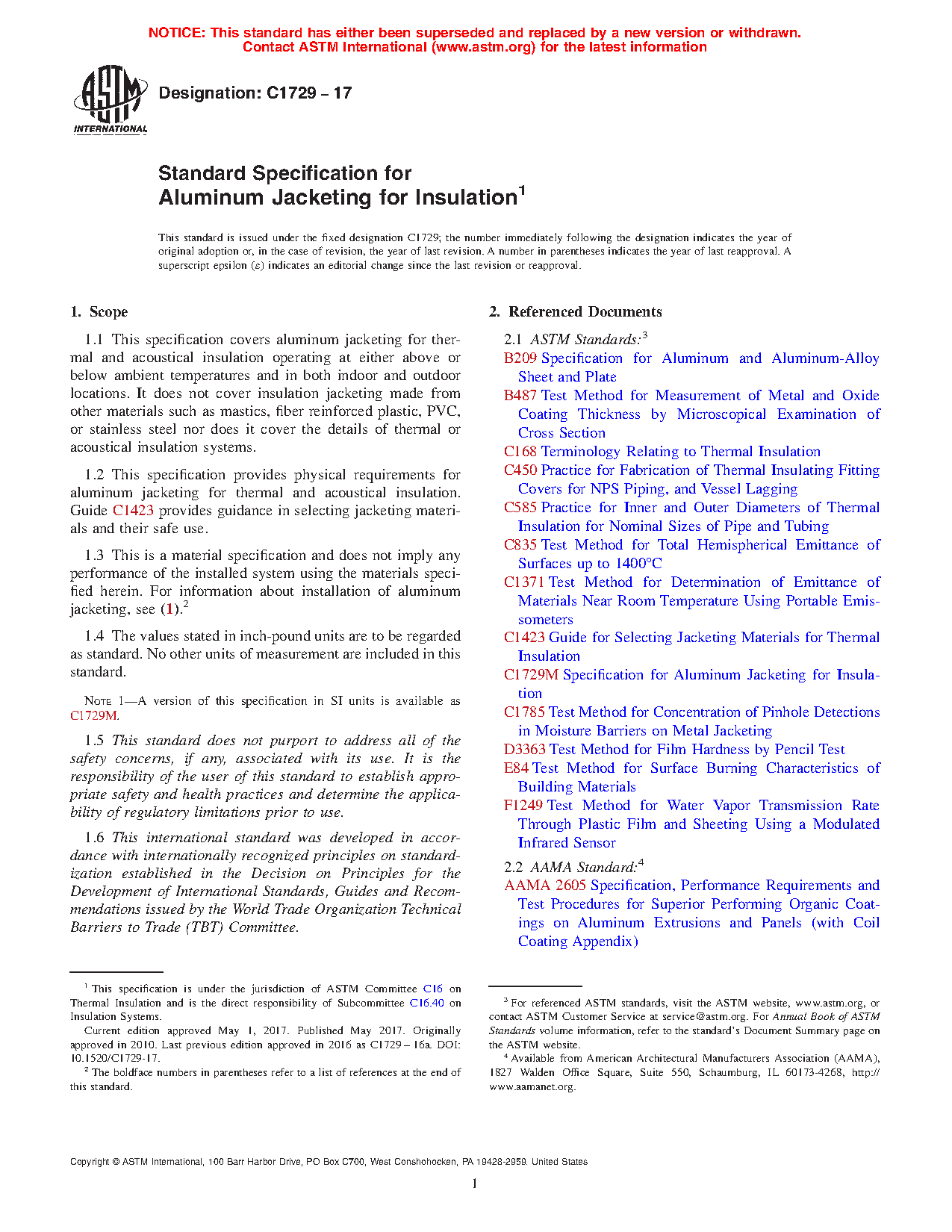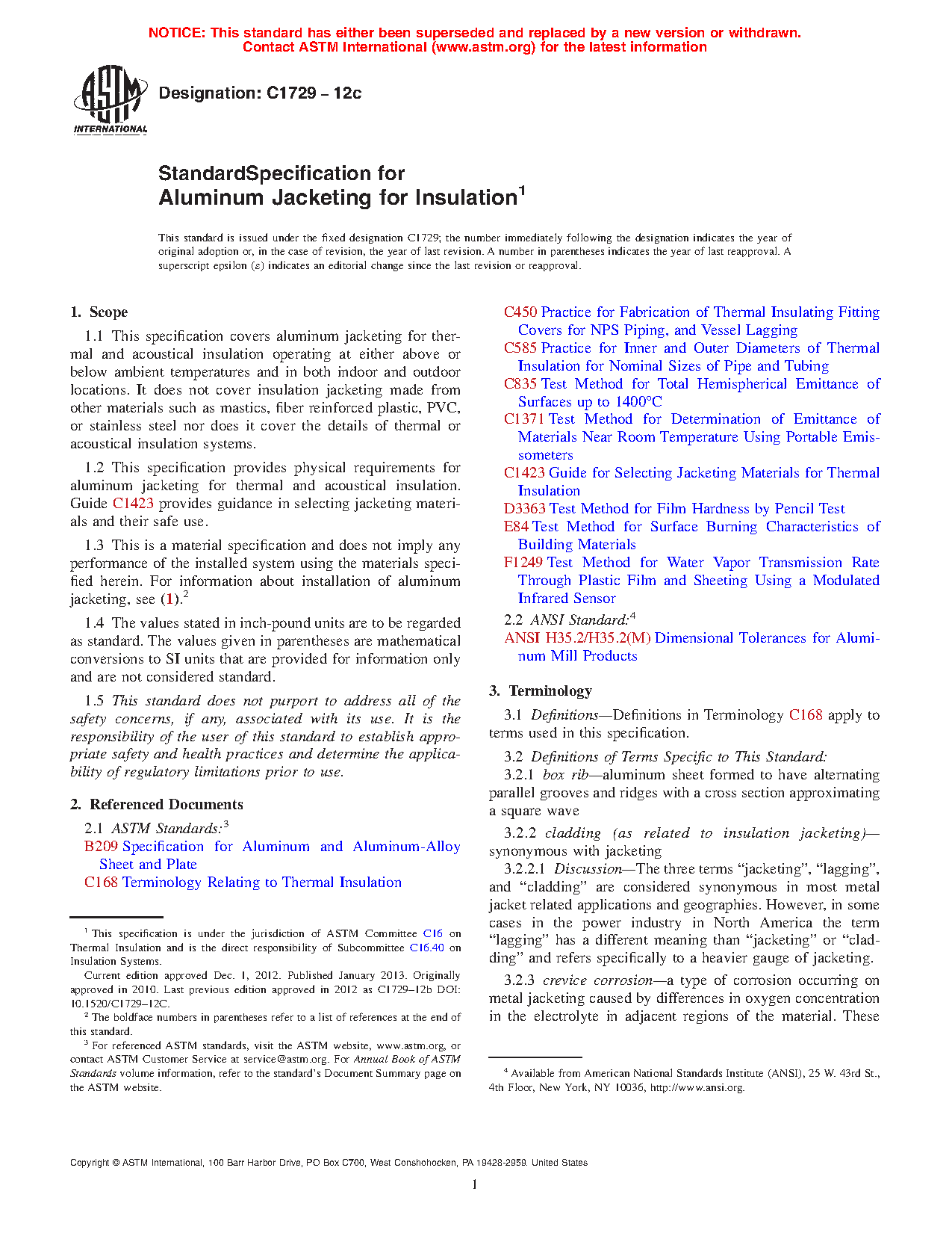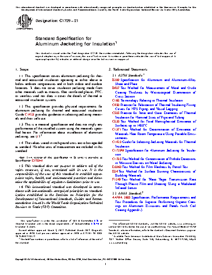 1.2 This specification provides physical requirements for aluminum jacketing for thermal and acoustical insulation. Guide C1423 provides guidance in selecting jacketing materials and their safe use.