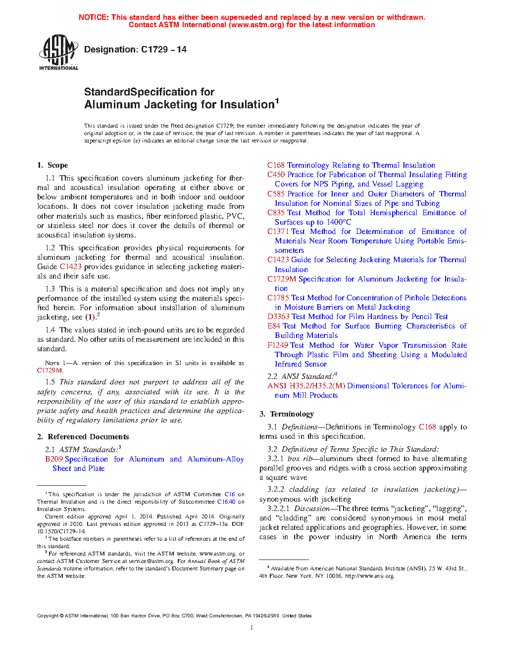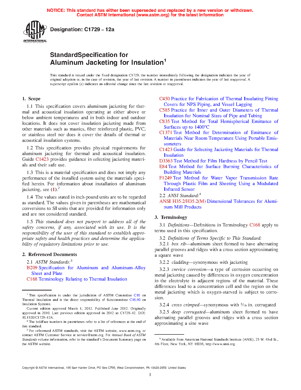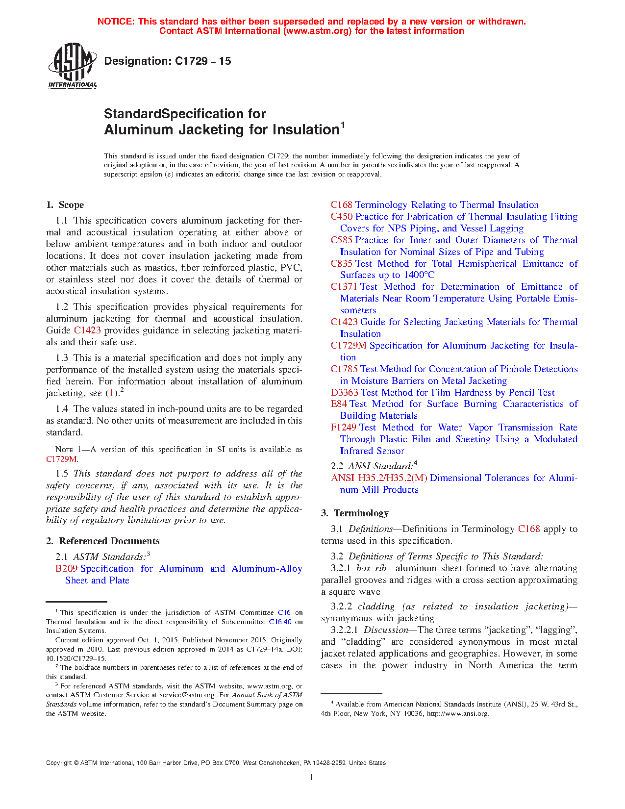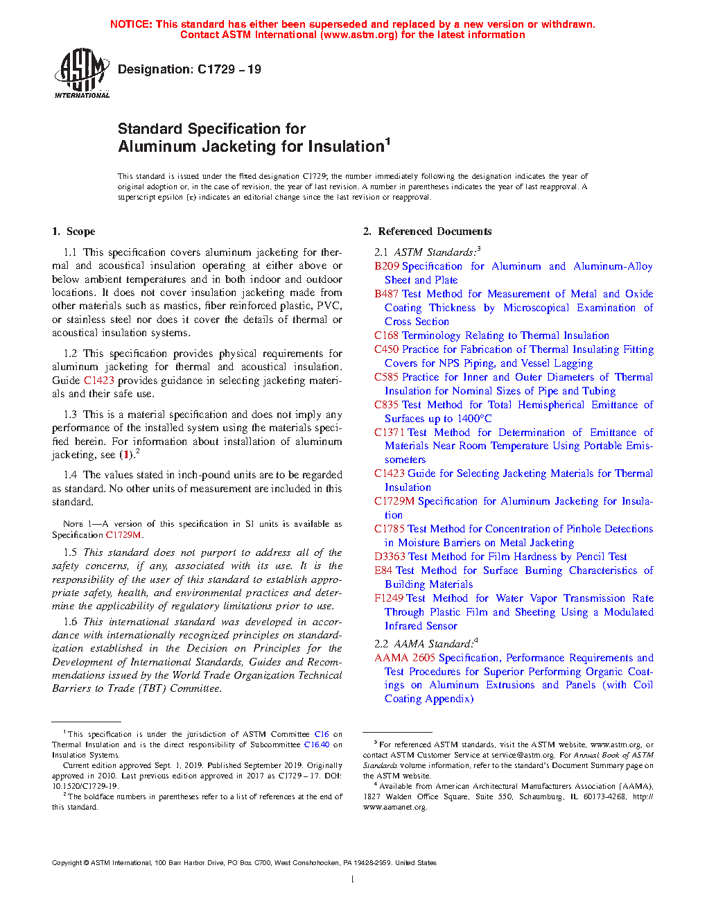 1.2 This specification provides physical requirements for aluminum jacketing for thermal and acoustical insulation. Guide C1423 provides guidance in selecting jacketing materials and their safe use.