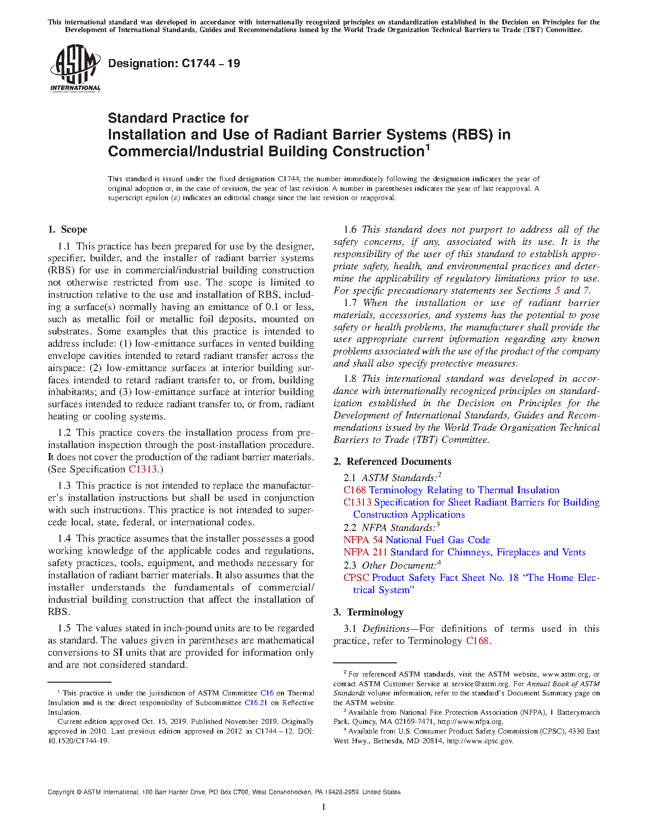1.1 This practice has been prepared for use by the designer, specifier, builder, and the installer of radiant barrier systems (RBS) for use in commercial/industrial building construction not otherwise restricted from use. The scope is limited to recommendations relative to the use and installation of RBS, including a surface(s) normally having an emittance of 0.1 or less, such as metallic foil or metallic foil deposits, mounted on substrates. Some examples that this practice is intended to address include: (1) low-emittance surfaces in vented building envelope cavities intended to retard radiant transfer across the airspace: (2) low-emittance surfaces at interior building surfaces intended to retard radiant transfer to, or from, building inhabitants; and (3) low-emittance surface at interior building surfaces intended to reduce radiant transfer to, or from, radiant heating or cooling systems.