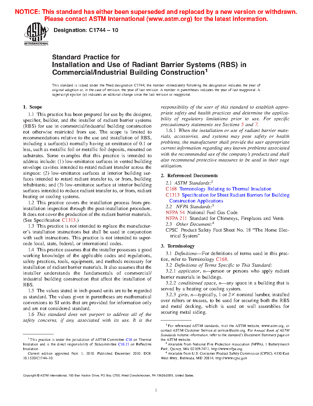 1.4 This practice assumes that the installer possesses a good working knowledge of the applicable codes and regulations, safety practices, tools, equipment, and methods necessary for installation of radiant barrier materials. It also assumes that the installer understands the fundamentals of commercial/industrial building construction that affect the installation of RBS.