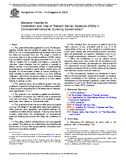 1.1 This practice has been prepared for use by the designer, specifier, builder, and the installer of radiant barrier systems (RBS) for use in commercial/industrial building construction not otherwise restricted from use. The scope is limited to instruction relative to the use and installation of RBS, including a surface(s) normally having an emittance of 0.1 or less, such as metallic foil or metallic foil deposits, mounted on substrates. Some examples that this practice is intended to address include: (1) low-emittance surfaces in vented building envelope cavities intended to retard radiant transfer across the airspace: (2) low-emittance surfaces at interior building surfaces intended to retard radiant transfer to, or from, building inhabitants; and (3) low-emittance surface at interior building surfaces intended to reduce radiant transfer to, or from, radiant heating or cooling systems.