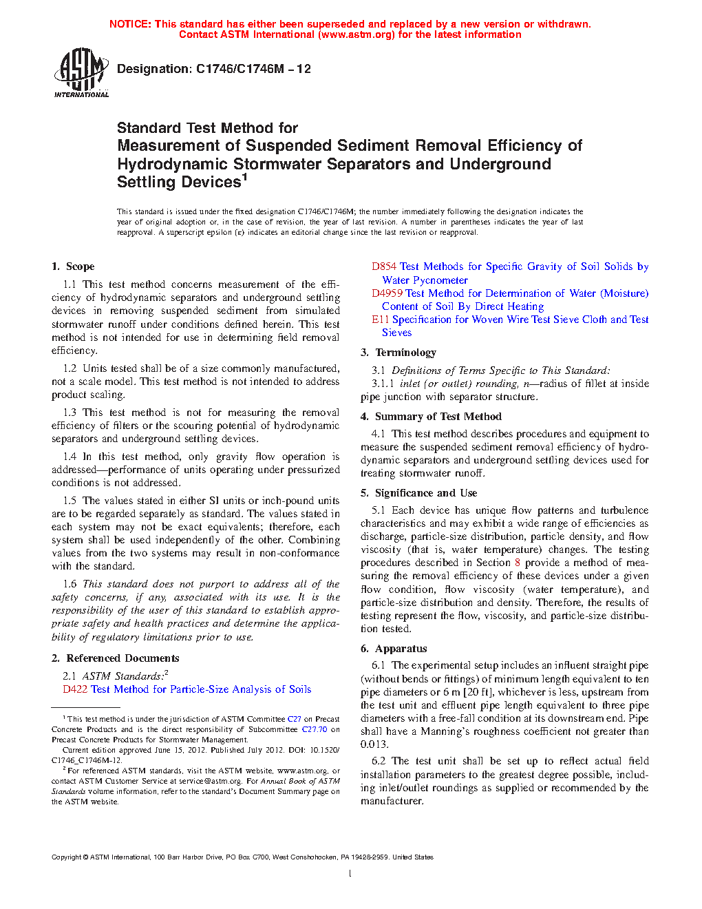 1.1 This test method concerns measurement of the efficiency of hydrodynamic separators and underground settling devices in removing suspended sediment from simulated stormwater runoff under conditions defined herein. This test method is not intended for use in determining field removal efficiency.