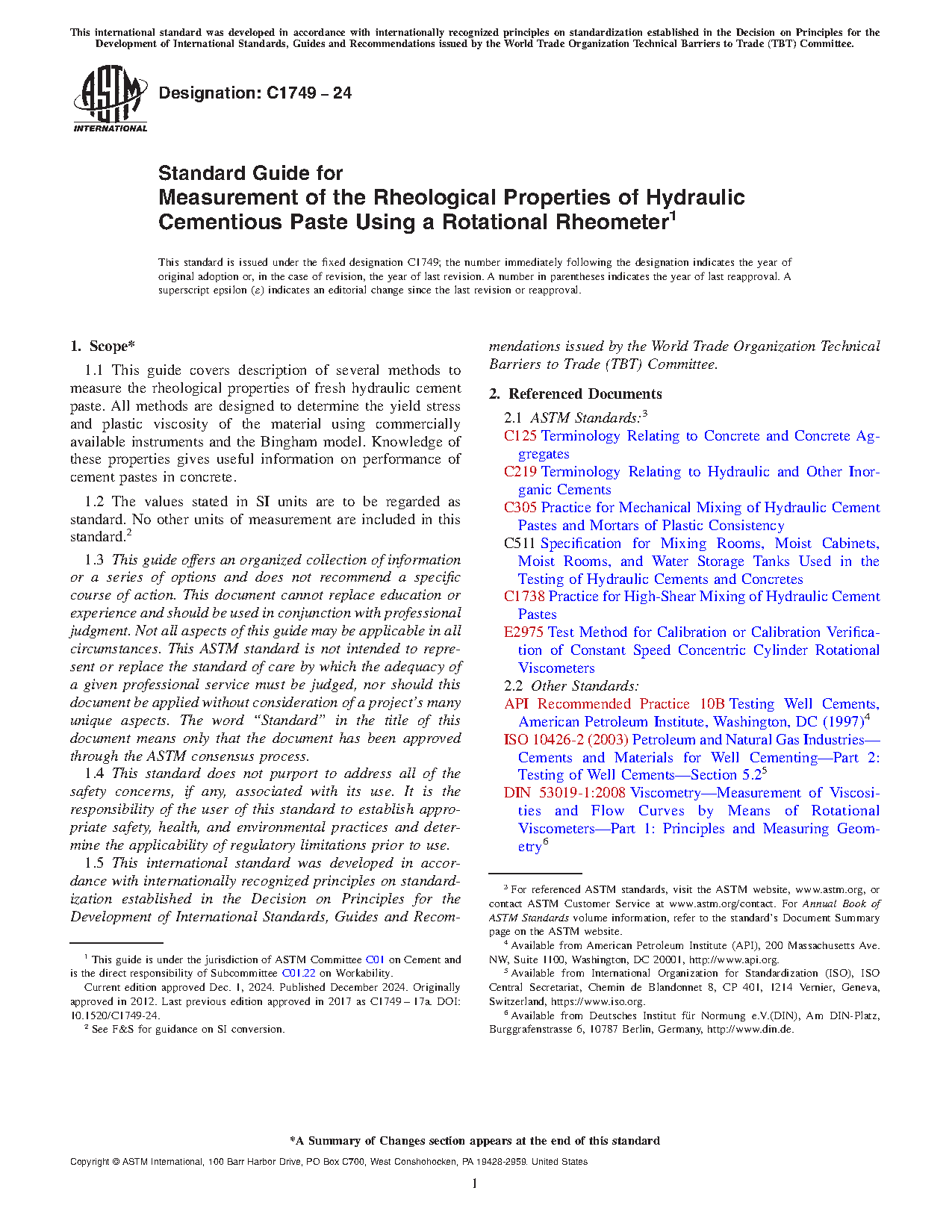 1.1 This guide covers description of several methods to measure the rheological properties of fresh hydraulic cement paste. All methods are designed to determine the yield stress and plastic viscosity of the material using commercially available instruments and the Bingham model. Knowledge of these properties gives useful information on performance of cement pastes in concrete.