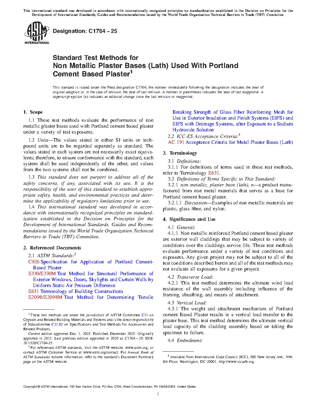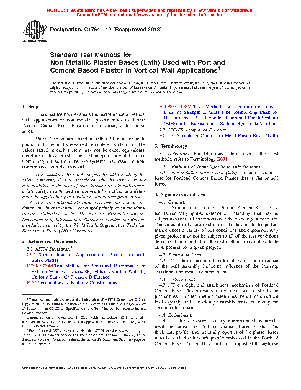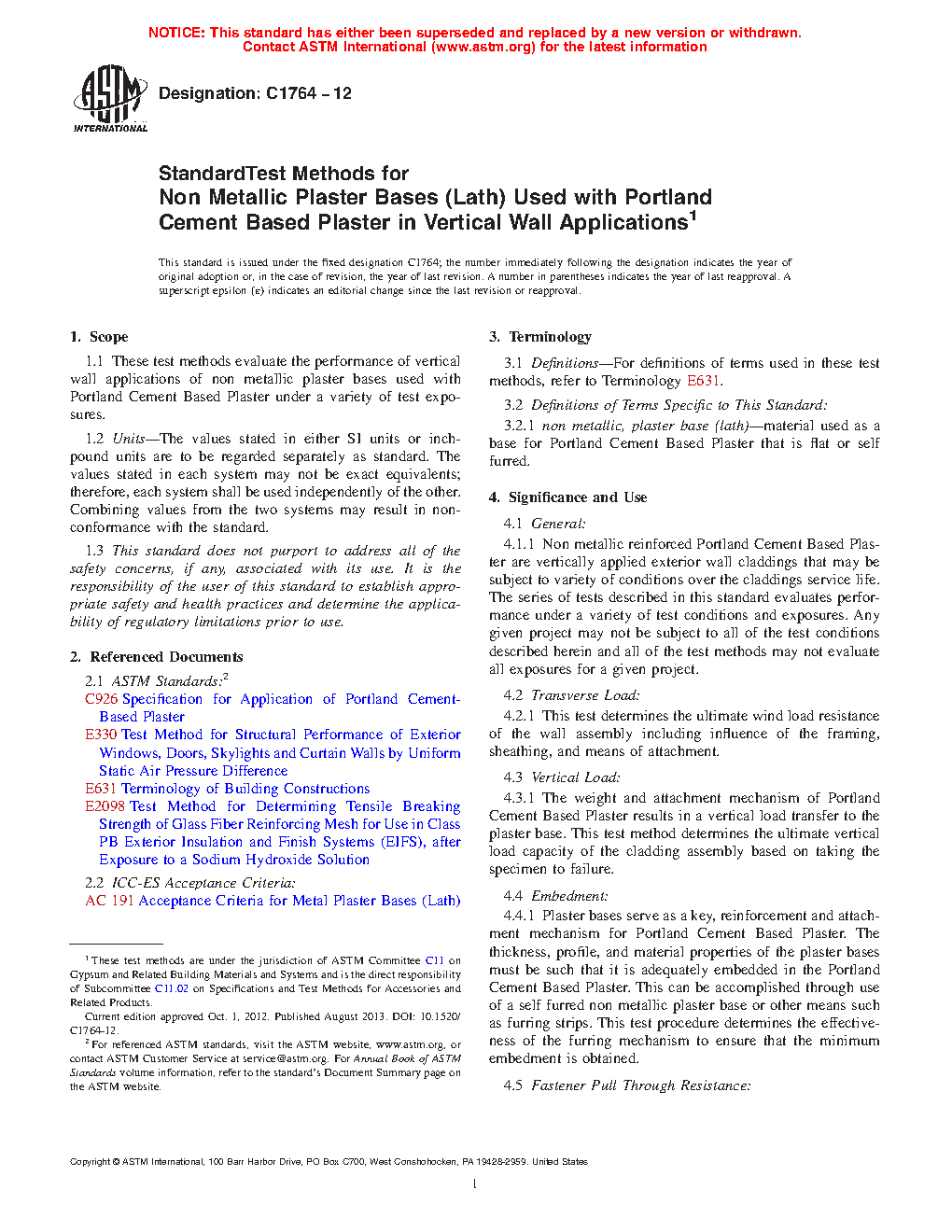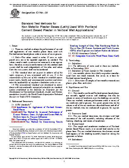 4.1.1 Non metallic reinforced Portland cement based plaster are vertically applied exterior wall claddings that may be subject to variety of conditions over the claddings service life. These test methods evaluate performance under a variety of test conditions and exposures. Any given project may not be subject to all of the test conditions described herein and all of the test methods may not evaluate all exposures for a given project.