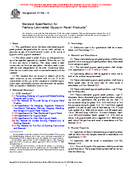 This specification establishes the requirements for factory-laminated gypsum panel products designed for use either on walls, ceilings, or partitions as part of a sound control system, or as a gypsum stud or gypsum coreboard. It covers materials and manufacture, physical properties, dimensions and tolerances, finish and appearance, sampling, inspection, rejection, certification, packaging, marking, shipping, handling, and storage.