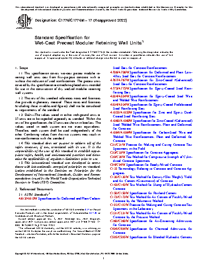 1.1 This specification covers wet-cast precast modular retaining wall units cast from first-purpose concrete with or without the inclusion of steel reinforcement. The precast units covered by this specification are machine-placed units intended for use in the construction of dry stacked modular retaining wall systems.