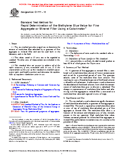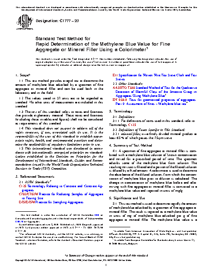 1.1 This test method provides a rapid test to determine the amount of methylene blue adsorbed by a specimen of fine aggregate or mineral filler and can be used both in the laboratory and in the field.