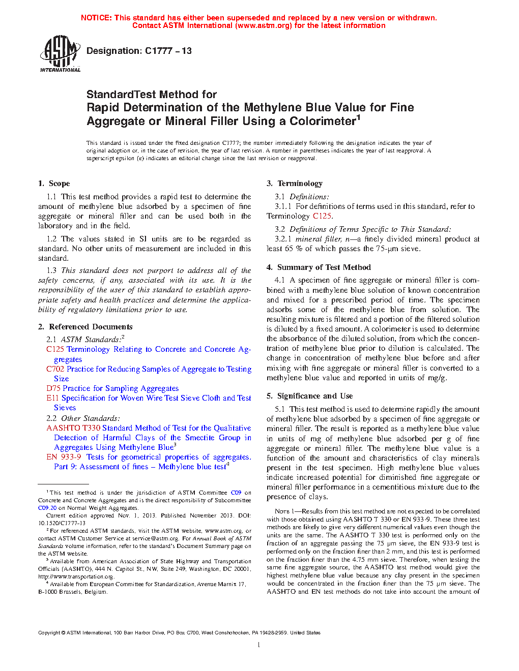 Note 1: Results from this test method are not expected to be correlated with those obtained using AASHTO T 330 or EN 933-9. These three test methods are likely to give very different numerical values even though the units are the same. The AASHTO T 330 test is performed only on the fraction of an aggregate passing the 75 µm sieve, the EN 933-9 test is performed only on the fraction finer than 2 mm, and this test is performed on the fraction finer than the 4.75 mm sieve. Therefore, when testing the same fine aggregate source, the AASHTO test method would give the highest methylene blue value because any clay present in the specimen would be concentrated in the fraction finer than the 75 µm sieve. The AASHTO and EN test methods do not take into account the amount of material passing the 75 µm sieve or 2 mm sieve, respectively. For example, a fine aggregate with high methylene blue value measured by the AASHTO method but low percentage passing the 75 µm sieve may have less effect on concrete performance than a fine aggregate with low methylene blue value measured by the AASHTO method but a high percentage passing the 75 µm sieve. In contrast, this test method expresses methylene blue value based on the entire fine aggregate or mineral filler specimen. Additionally, the AASHTO and EN test methods use titration to determine the amount of methylene blue of known concentration that is adsorbed by a specimen and require the operator to visually determine the end point of the test. In contrast, this test method uses a colorimeter to detect the change in concentration of methylene blue solution before and after being mixed with the fine aggregate or mineral filler specimen.