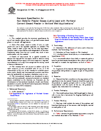 This standard covers the use of non-metallic plaster bases with portland cement-based plaster in vertical wall applications and provides details of requirements with respect to inspection of the material as well as rejection, product packaging and marking, and performance.