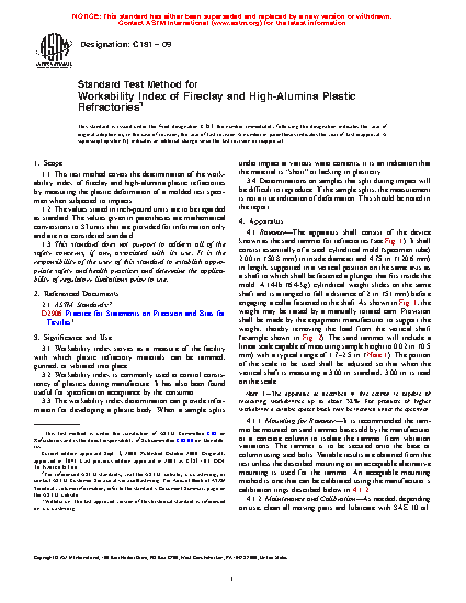 1.1 This test method covers the determination of the workability index of fireclay and high-alumina plastic refractories by measuring the plastic deformation of a molded test specimen when subjected to impacts.
