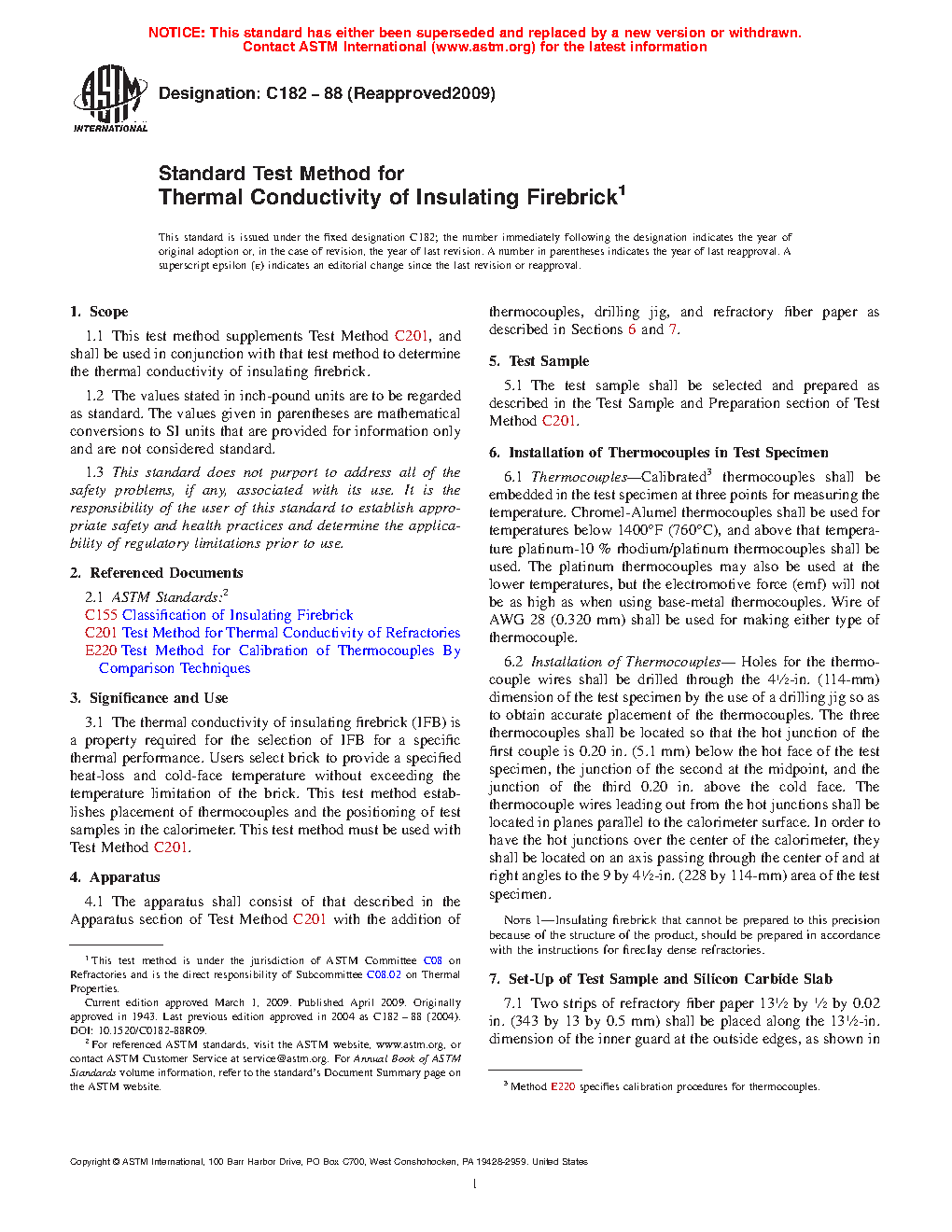 The thermal conductivity of insulating firebrick (IFB) is a property required for the selection of IFB for a specific thermal performance. Users select brick to provide a specified heat-loss and cold-face temperature without exceeding the temperature limitation of the brick. This test method establishes placement of thermocouples and the positioning of test samples in the calorimeter. This test method must be used with Test Method C 201