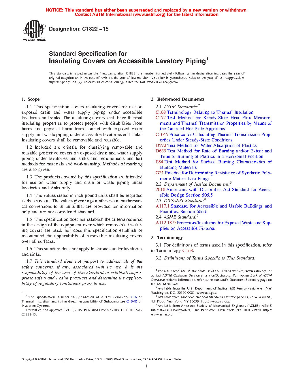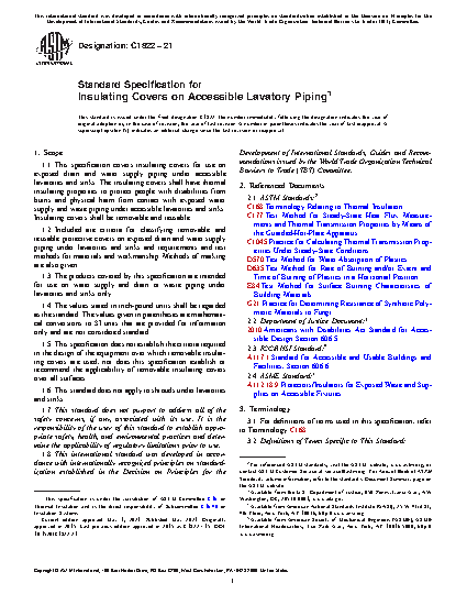 This specification is concerned with insulating covers for use on exposed drain and water supply piping under accessible lavatories and sinks. The thermal insulating properties of the insulating covers are specified with the aim of protecting people with disabilities from burns and physical harm from contact with exposed water supply and waste piping under accessible lavatories and sinks. The insulating covers shall be removable and reusable, and shall satisfy the requirements of the Americans with Disabilities Act 4.19.4: 2010 Americans with Disabilities Act Standard for Accessible Design Section 606.5, ICC/ANSI A117.1 2012 (Standard for Accessible and Usable Buildings and Facilities - for Persons with Physical Disabilities) section 606.6 (Exposed Pipes and Surfaces).