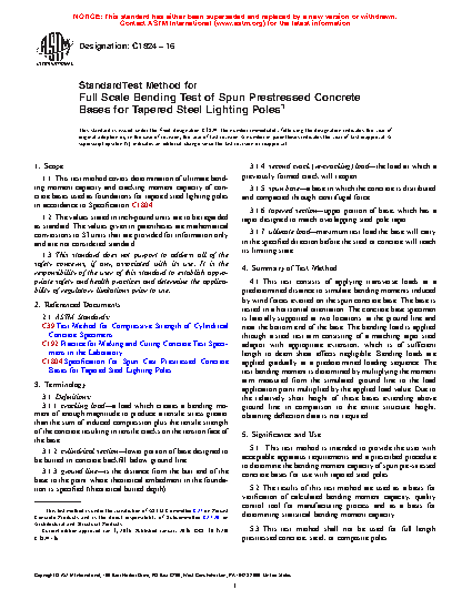 5.1 This test method is intended to provide the user with acceptable apparatus requirements and a prescribed procedure to determine the bending moment capacity of spun pre-stressed concrete bases for use with tapered steel poles.