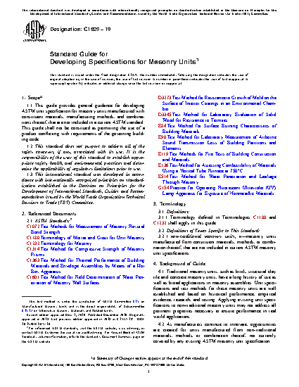 1.1 This guide provides general guidance for developing ASTM unit specification for masonry units manufactured with constituent materials, manufacturing methods, and combinations thereof, that are not included in a current ASTM standard. This guide shall not be construed as permitting the use of a product conflicting with requirements of the governing building code.
