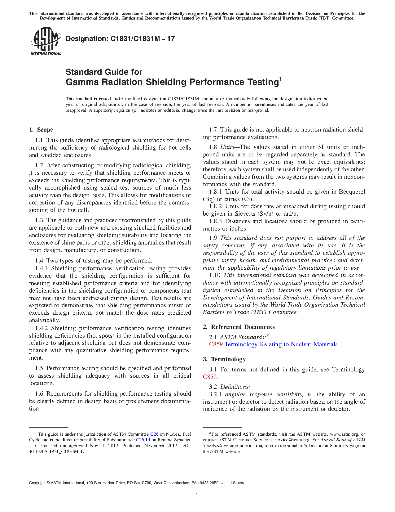 1.2 After constructing or modifying radiological shielding, it is necessary to verify that shielding performance meets or exceeds the shielding performance requirements. This is typically accomplished using sealed test sources of much less activity than the design basis. This allows for modifications or correction of any discrepancies identified before the commissioning of the hot cell.