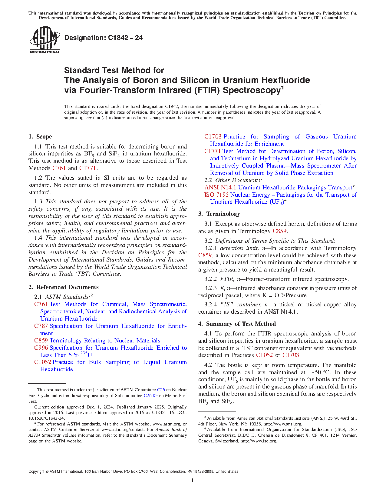 1.1 This test method is suitable for determining boron and silicon impurities as BF3 and SiF4 in uranium hexafluoride. This test method is an alternative to those described in Test Methods C761 and C1771.