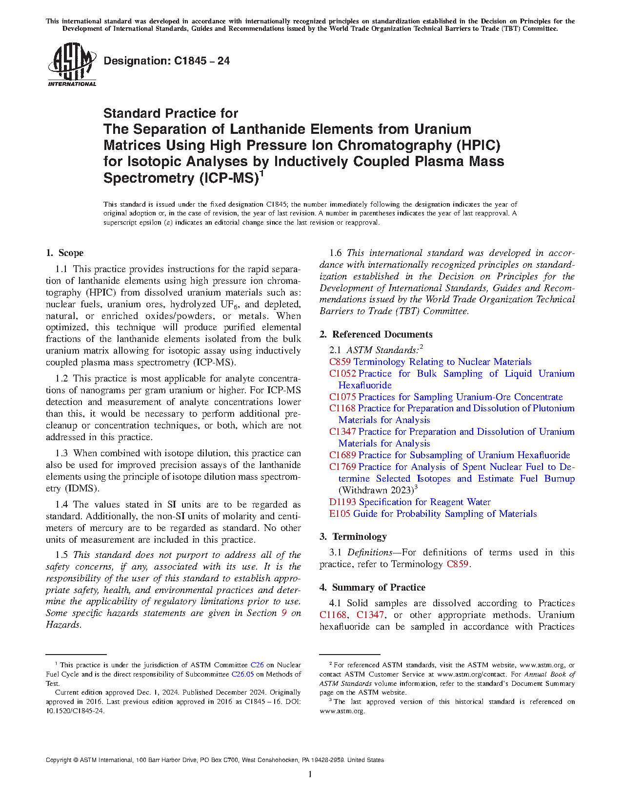 1.1 This practice provides instructions for the rapid separation of lanthanide elements using high pressure ion chromatography (HPIC) from dissolved uranium materials such as: nuclear fuels, uranium ores, hydrolyzed UF6, and depleted, natural, or enriched oxides/powders, or metals. When optimized, this technique will produce purified elemental fractions of the lanthanide elements isolated from the bulk uranium matrix allowing for isotopic assay using inductively coupled plasma mass spectrometry (ICP-MS).