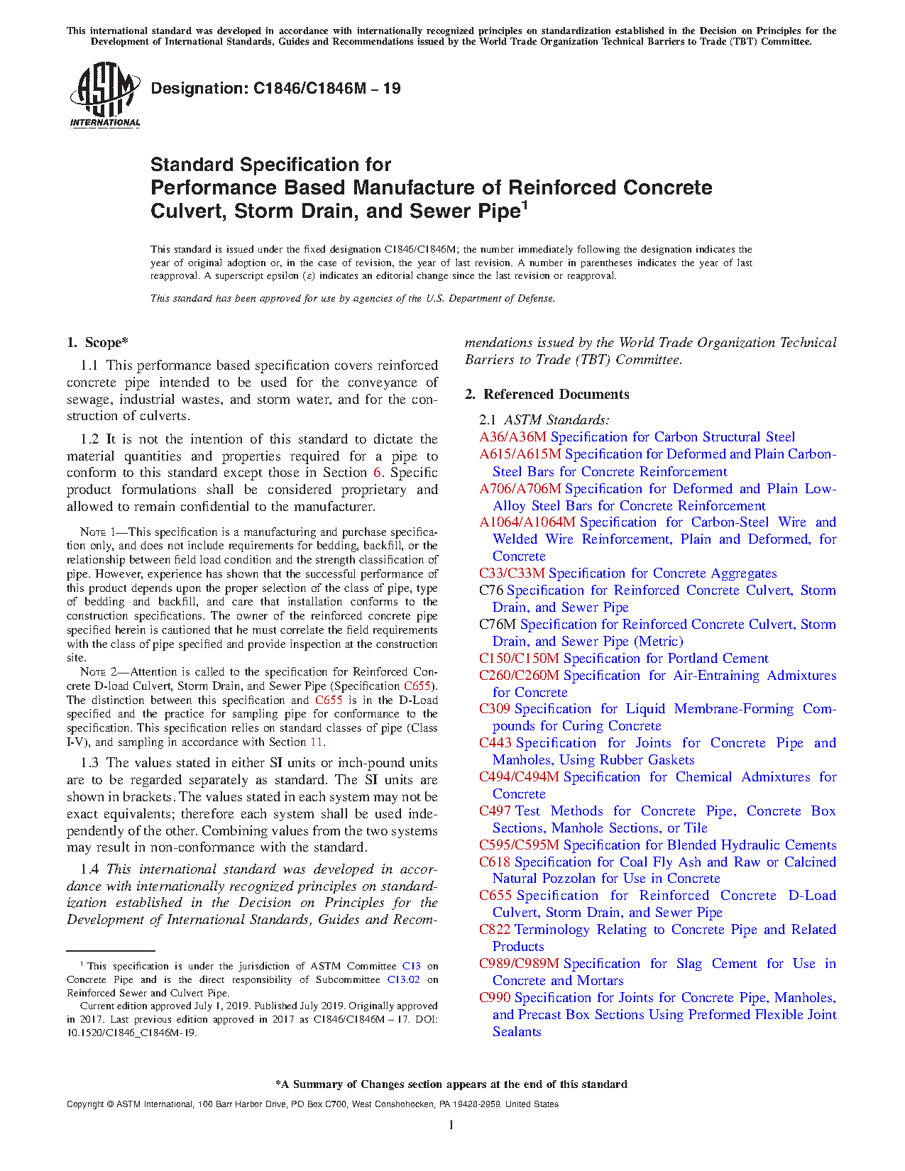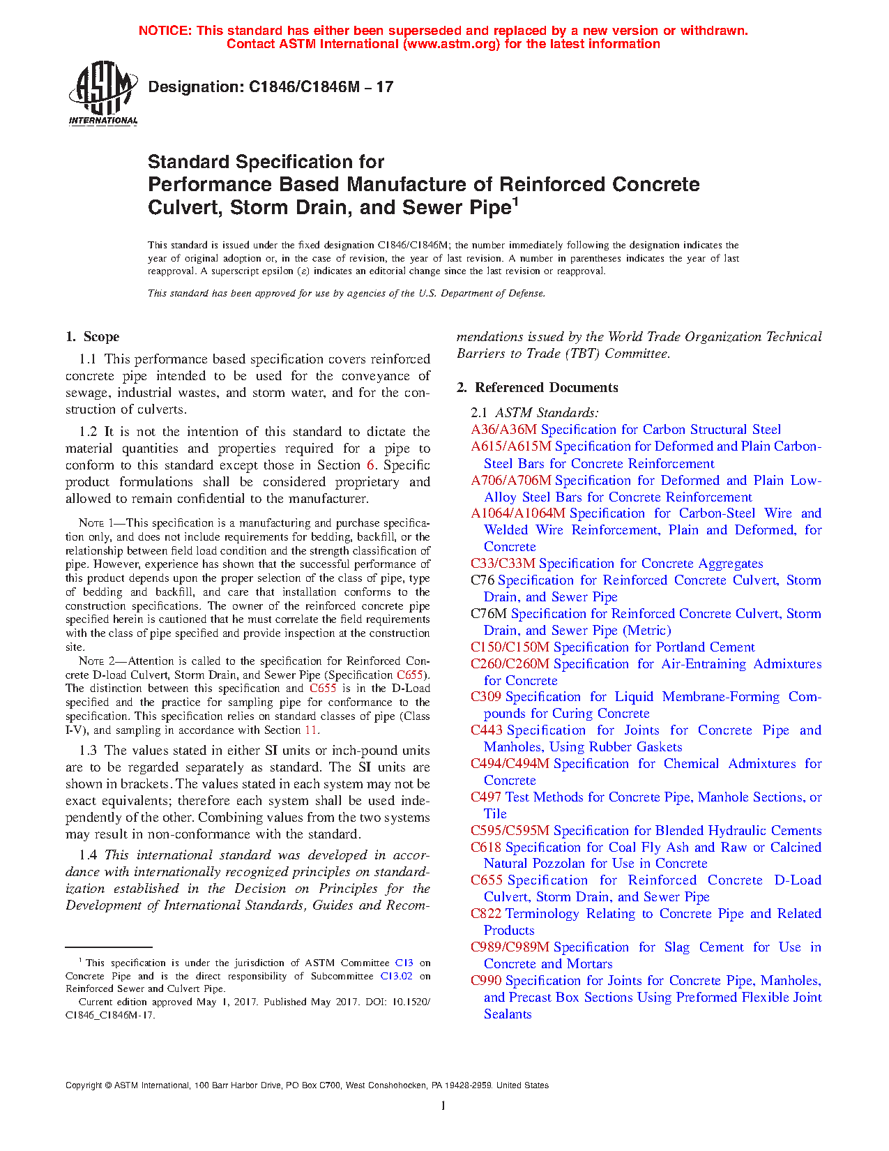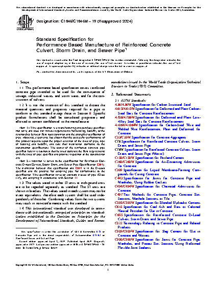 1.1 This performance based specification covers reinforced concrete pipe intended to be used for the conveyance of sewage, industrial wastes, and storm water, and for the construction of culverts.