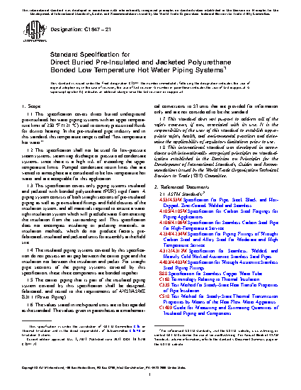 1.1 This specification covers direct buried underground pre-insulated, hot water piping systems with an upper temperature limit of 250 °F (121 °C) used to convey pressurized fluids for district heating. In the pre-insulated pipe industry and in this standard, this temperature range is called “low temperature hot water”.