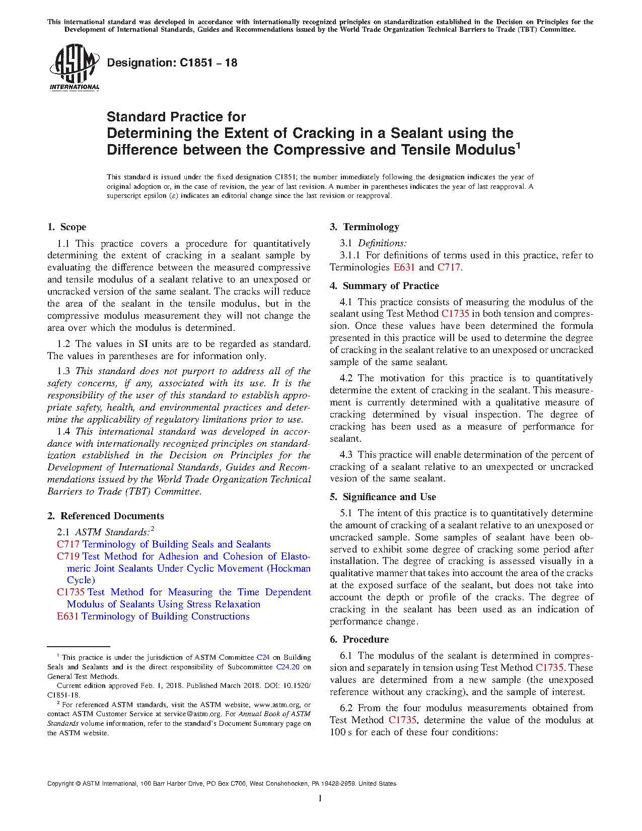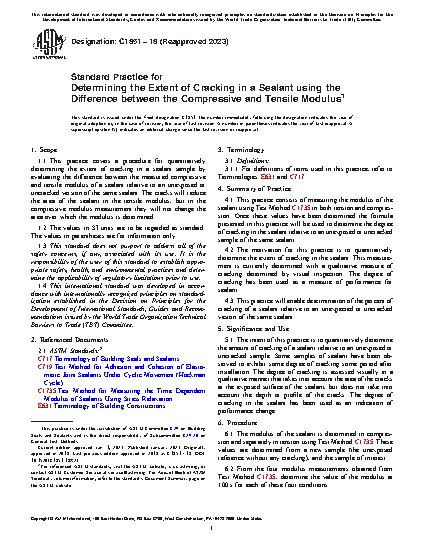 1.1 This practice covers a procedure for quantitatively determining the extent of cracking in a sealant sample by evaluating the difference between the measured compressive and tensile modulus of a sealant relative to an unexposed or uncracked version of the same sealant. The cracks will reduce the area of the sealant in the tensile modulus, but in the compressive modulus measurement they will not change the area over which the modulus is determined.