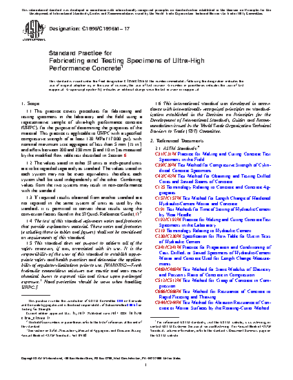 1.1 This practice covers procedures for fabricating and testing specimens in the laboratory and the field using a representative sample of ultra-high performance concrete (UHPC), for the purpose of determining the properties of the material. This practice is applicable to UHPC with a specified compressive strength of at least 120 MPa (17 000 psi), with nominal maximum size aggregate of less than 5 mm [1/4 in.] and a flow between 200 mm and 250 mm [8 and 10 in.] as measured by the modified flow table test described in Section 6.