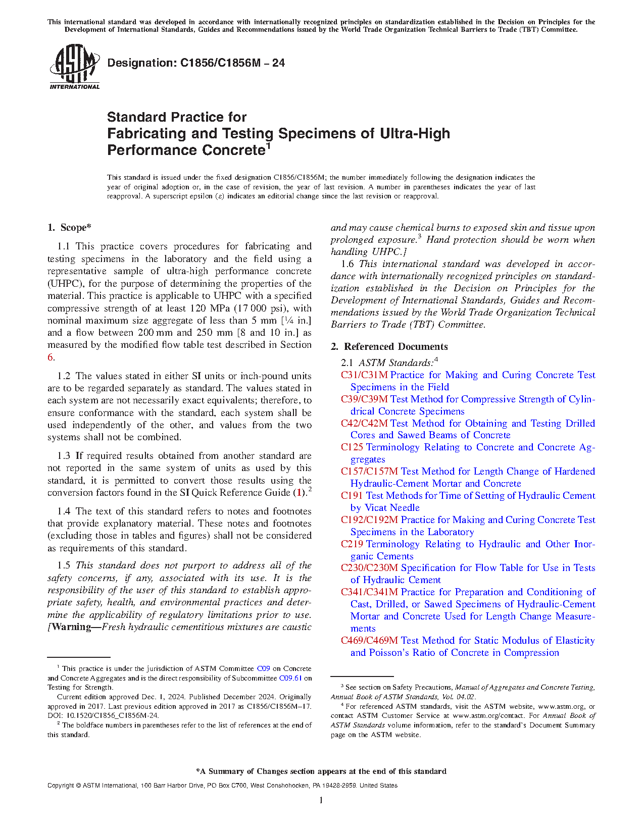 1.5 This standard does not purport to address all of the safety concerns, if any, associated with its use. It is the responsibility of the user of this standard to establish appropriate safety, health, and environmental practices and determine the applicability of regulatory limitations prior to use. [Warning—Fresh hydraulic cementitious mixtures are caustic and may cause chemical burns to exposed skin and tissue upon prolonged exposure.3 Hand protection should be worn when handling UHPC.]