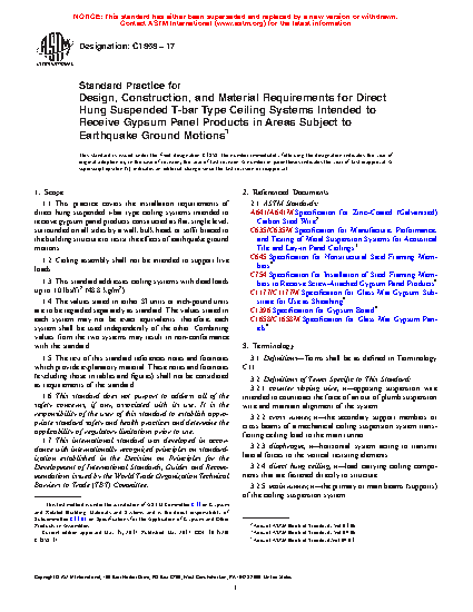 1.1 This practice covers the installation requirements of direct hung suspended t-bar type ceiling systems intended to receive gypsum panel products constructed as flat, single level, surrounded on all sides by a wall, bulk head, or soffit braced to the building structure to resist the effects of earthquake ground motions.