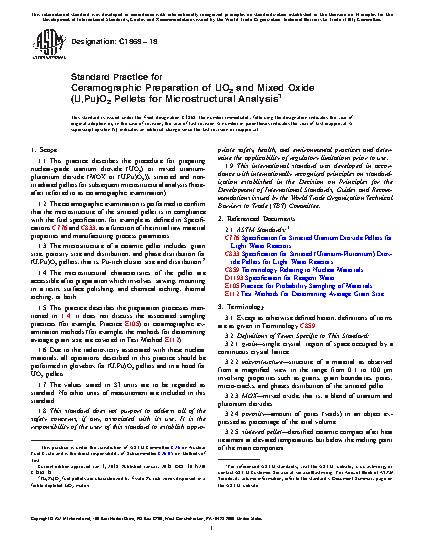1.2 The ceramographic examination is performed to confirm that the microstructure of the sintered pellet is in compliance with the fuel specification, for example as defined in Specifications C776 and C833, as a function of the initial raw material properties and manufacturing process parameters.